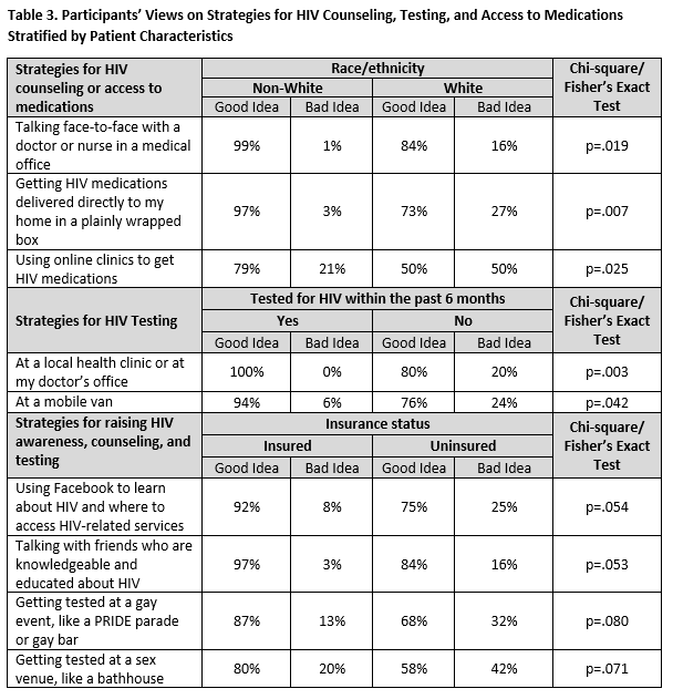 Table 3. Participants’ Views on Strategies for HIV Counseling, Testing, and Access to Medications Stratified by Patient Characteristics