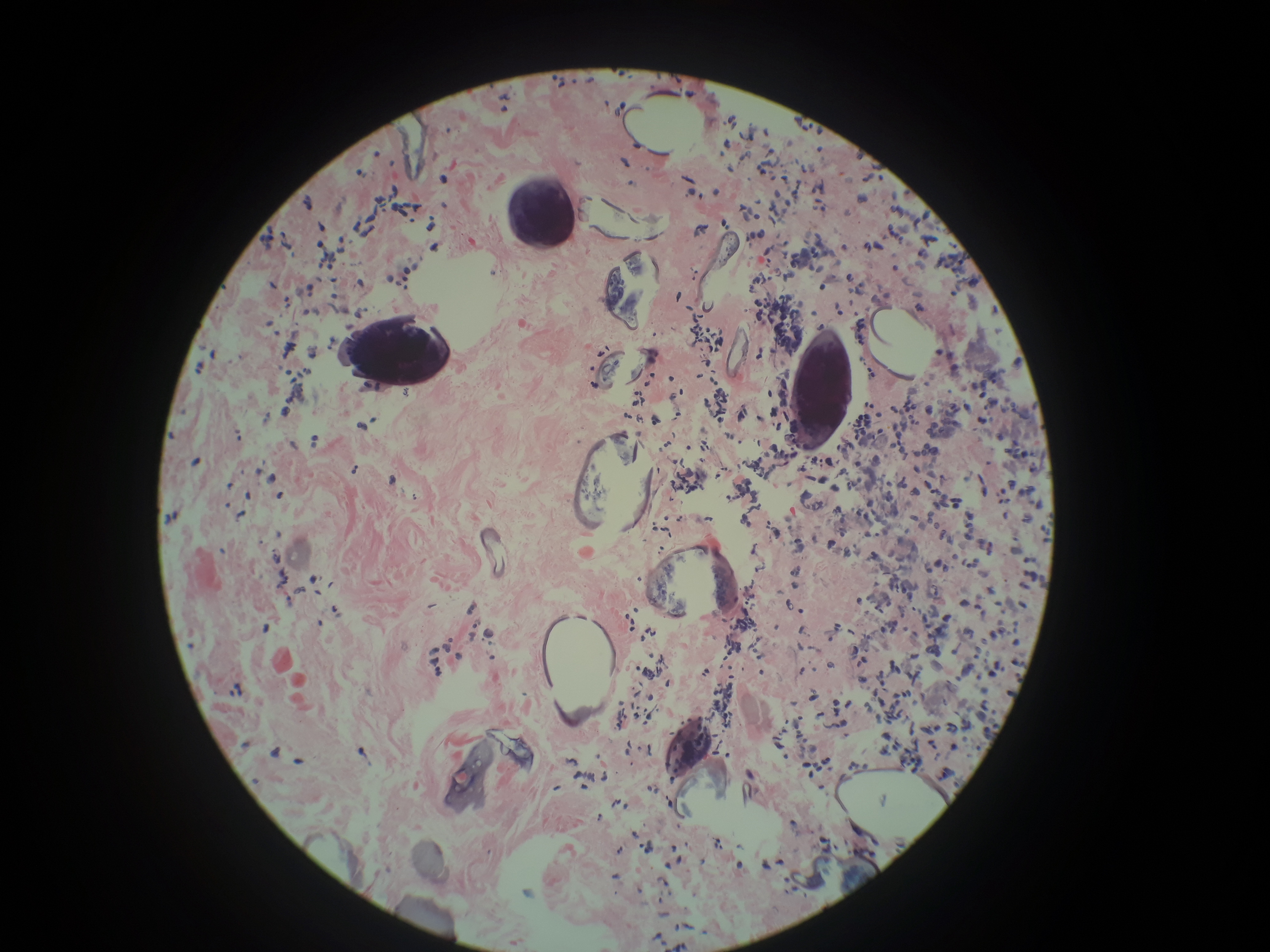 A 79 year old female presented with bleeding into her colostomy bag and associated left lower abdominal pain for one day duration. She has a history of colon cancer diagnosed 25years ago, which was treated with chemotherapy and a left hemicolectomy with colostomy formation. On admission, her blood pressure was 78/51 mm Hg. She looked pale and her abdominal examination revealed tenderness in left lower quadrant. Laboratory findings showed hemoglobin of 5.3 g/dl. CT abdomen showed extensive colitis. She was resuscitated and treated with Piperacillin-Tazobactum for 6 days with minimal improvement. Stool for ova and parasites were negative. EGD was unremarkable with no evidence of acute bleeding. Colonoscopy showed severe ulcerative colitis in the distal 30cm of colon. Pathology revealed ischemic and necrotic tissue with numerous calcified schistosoma eggs in the colon (Figure 1). After furthering questioning, the patient mentioned that she travelled to South China 8months prior to presentation. Patient was then treated with Praziquental for one day for possible Schistosomiasis Japonicum, given the regional distribution. The patient showed marked clinical improvement and was discharged home later.Figure 1: Histopathology image showing calcified schistosoma eggs in colon