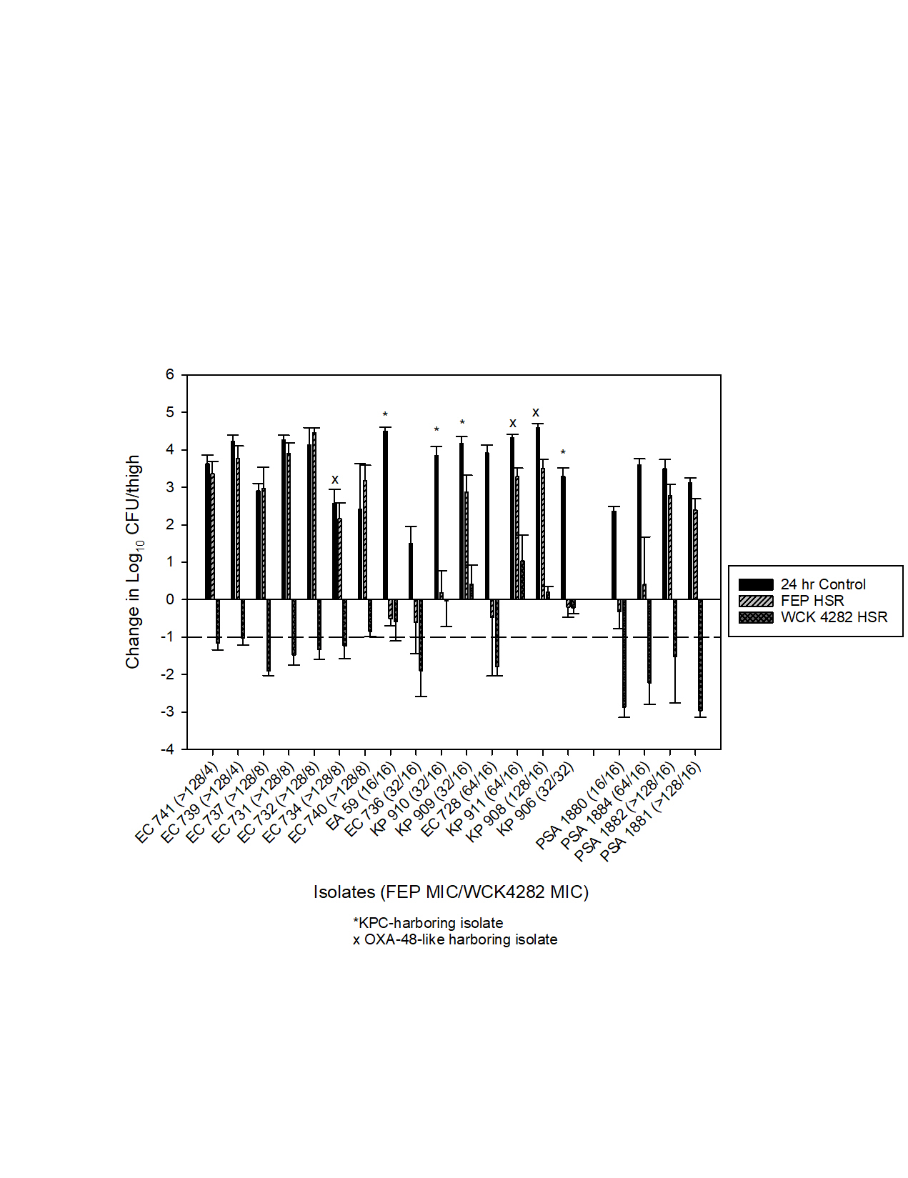 Figure 1. Mean Change in log10CFU/thigh for 24 h controls, FEP HSR, and WCK 4282 HSR across the tested MIC distribution.