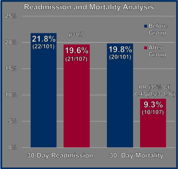 Figure 3: 30-day readmission rate and 30-day mortality rate in the pre- and post-intervention groups.