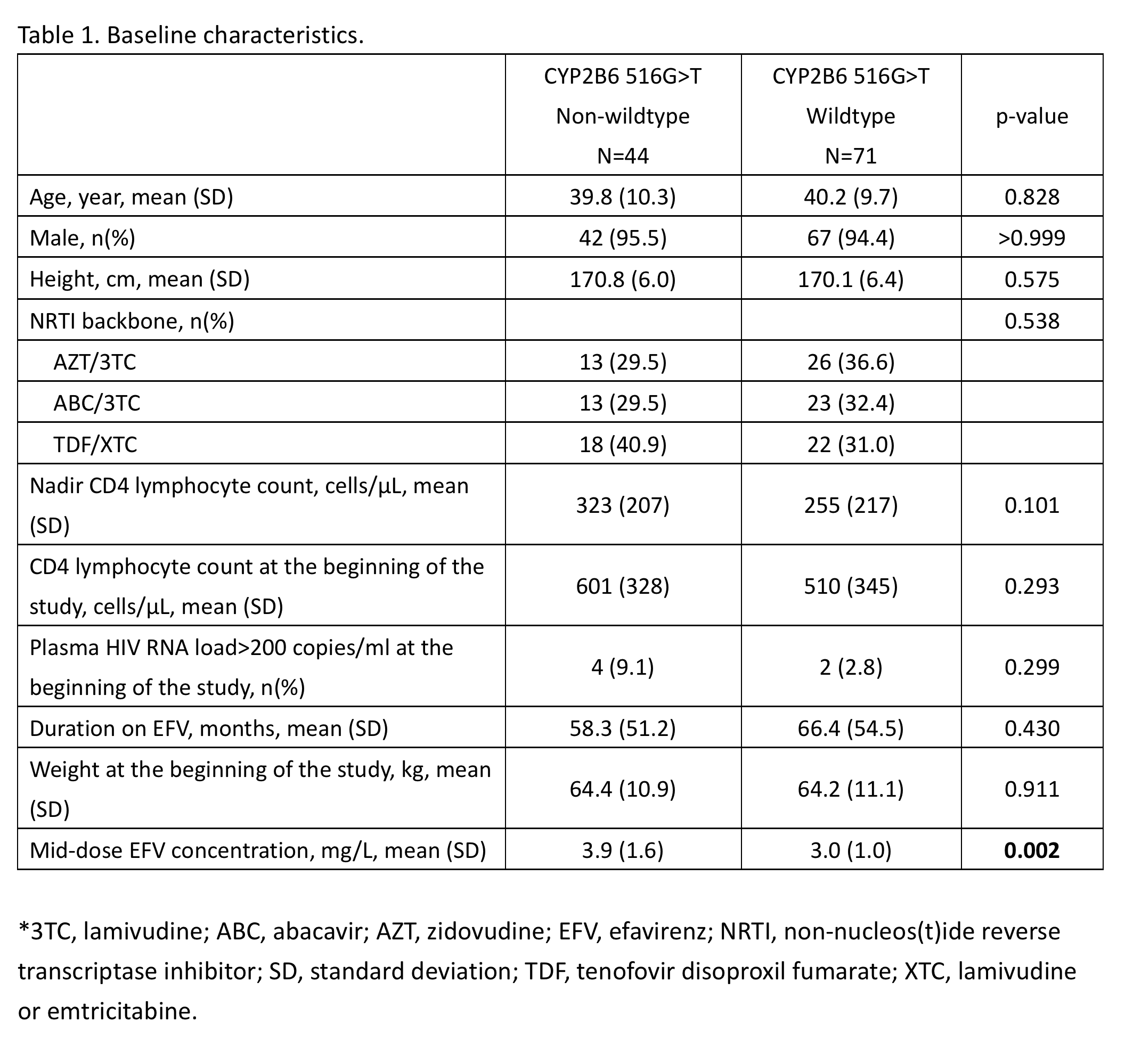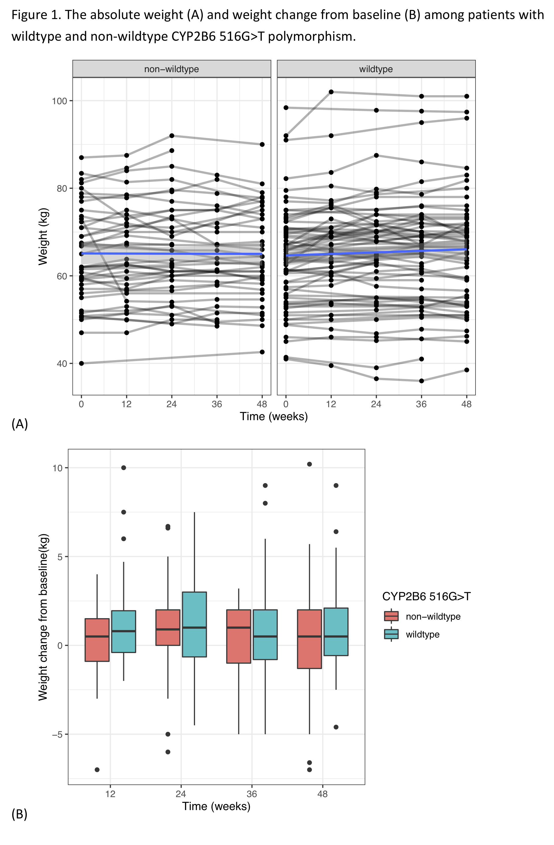Figure 1. The absolute weight (A) and weight change from baseline (B) among patients with wildtype and non-wildtype CYP2B6 516G>T polymorphism..png)
