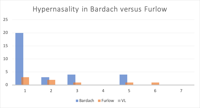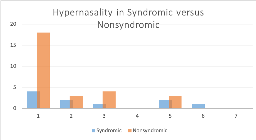The authors evaluated for a statistical correlation of (VPI) in syndromic versus nonsyndromic patients. Additionally, the authors evaluated hypernasality following primary palatoplasties, looking to see if there was an association between the surgical technique and postoperative hypernasality.