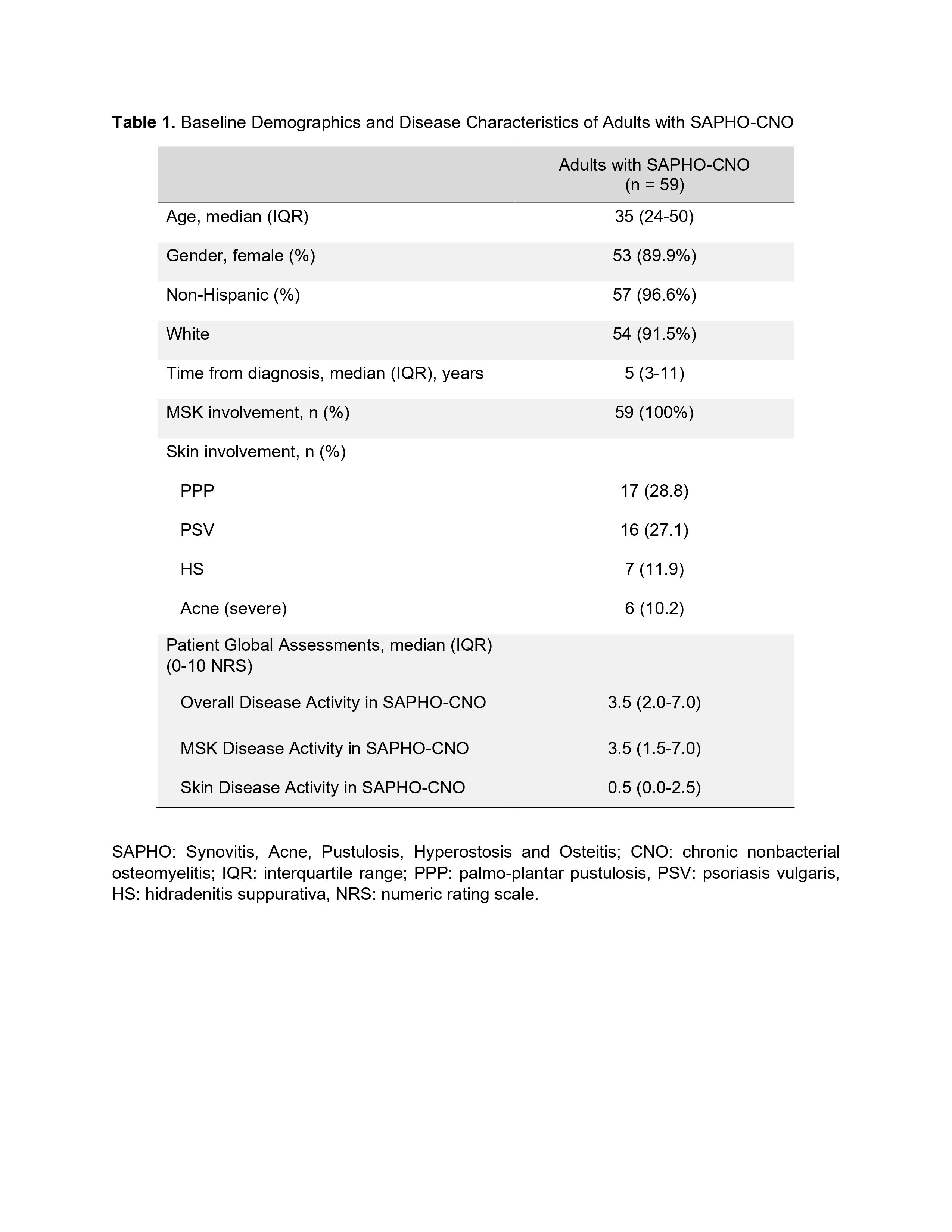 Results: Fifty-nine enrolled subjects completed their baseline study visit and were included in this cross-sectional analysis. The findings are summarized in Tables 1 and 2. Adults with SAPHO-CNO were predominantly female non-Hispanic Caucasians, with a reported median time from diagnosis of 5 years with an interquartile range (IQR) of 3-11 years. All subjects had MSK involvement (bone and/or joint symptoms), with the most common cutaneous manifestations of palmo-plantar pustulosis (PPP) and psoriasis vulgaris (PSV), followed by hidradenitis suppurative (HS) and severe acne (Table 1).