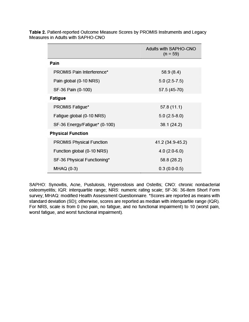 Conclusion: Adult SAPHO-CNO patients, with a median of 5 years since diagnosis, demonstrate multidimensional symptomatology with high pain and fatigue, and low function as reported by PROMIS and legacy instruments.