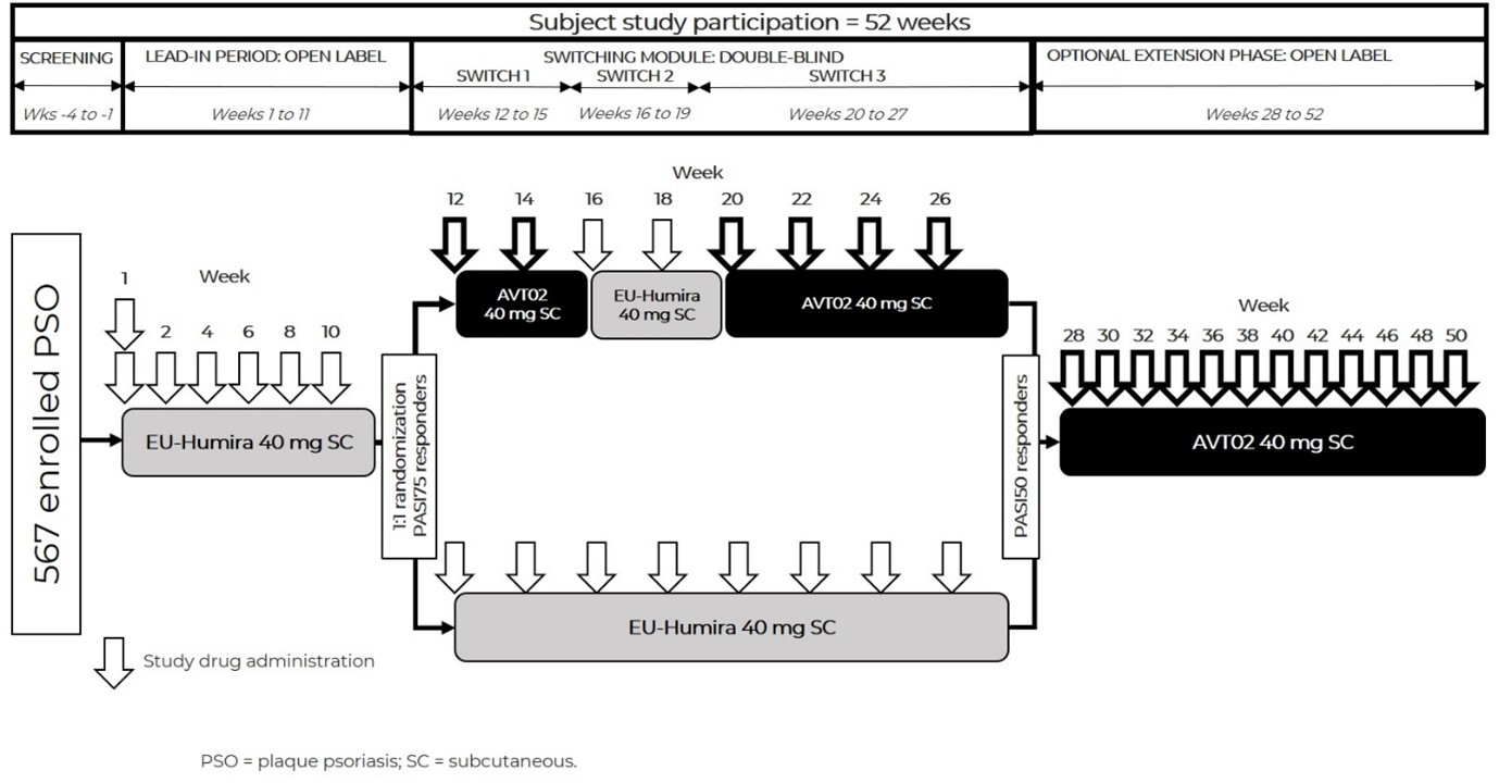 Methods: Participants with chronic plaque psoriasis were selected for the study population. This population was judged to be adequately sensitive to detect pharmacokinetic (PK) differences resulting from switching between reference adalimumab and AVT02, as well as differences in common adverse events and immunogenicity. This population was also considered the most sensitive to compare treatment efficacy. This study enrolled 567 participants. Following a 12-week open label lead-in-period when all participants received reference adalimumab, participants with Psoriasis Area Severity Index(PASI)75 response were randomized 1:1 to receive AVT02 alternating with reference adalimumab (switching arm) or reference adalimumab (non-switching arm). At Week 28, participants with PASI50 response could opt to take part in an open-label extension phase receiving AVT02 up to Week 50, with end-of-study follow up at Week 52 (Figure 1).
