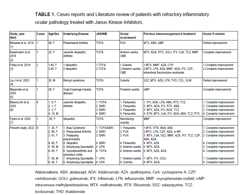 Methods: Multicenter study of 8 patients with refractory IOP treated with JAKINIB. For Literature review a search was conducted in PubMed, Embase and the Cochrane library from their inception to 1st January 2022, and conference proceedings from four major rheumatology conferences. Original research articles studying JAKINIB treatment in patients with IOP were included. In addition, a therapeutical approach of refractory IOP is proposed.