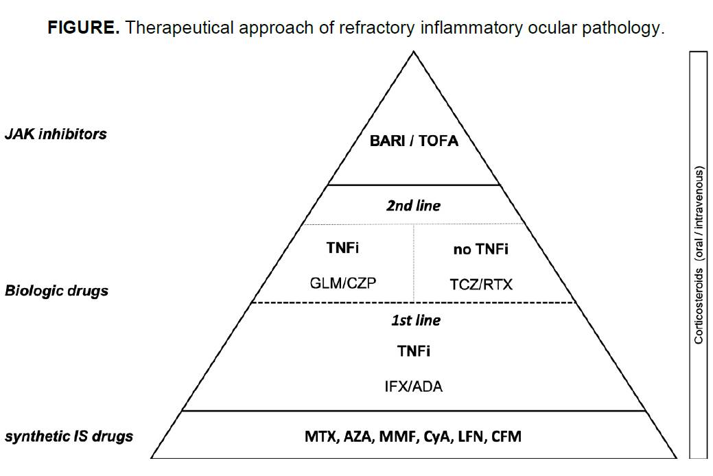 Background/Purpose: Inflammatory ocular pathology (IOP) includes internal (uveitis) and external [mainly ocular surface pathology such as epi/scleritis and peripheral ulcerative keratitis (PUK)] involvement. IOP may be severe ocular conditions refractory to conventional immunosuppressants and even biological therapy. Janus Kinase inhibitors (JAKINIB) had shown efficacy in refractory cases of different immune-mediated inflammatory diseases (IMID).