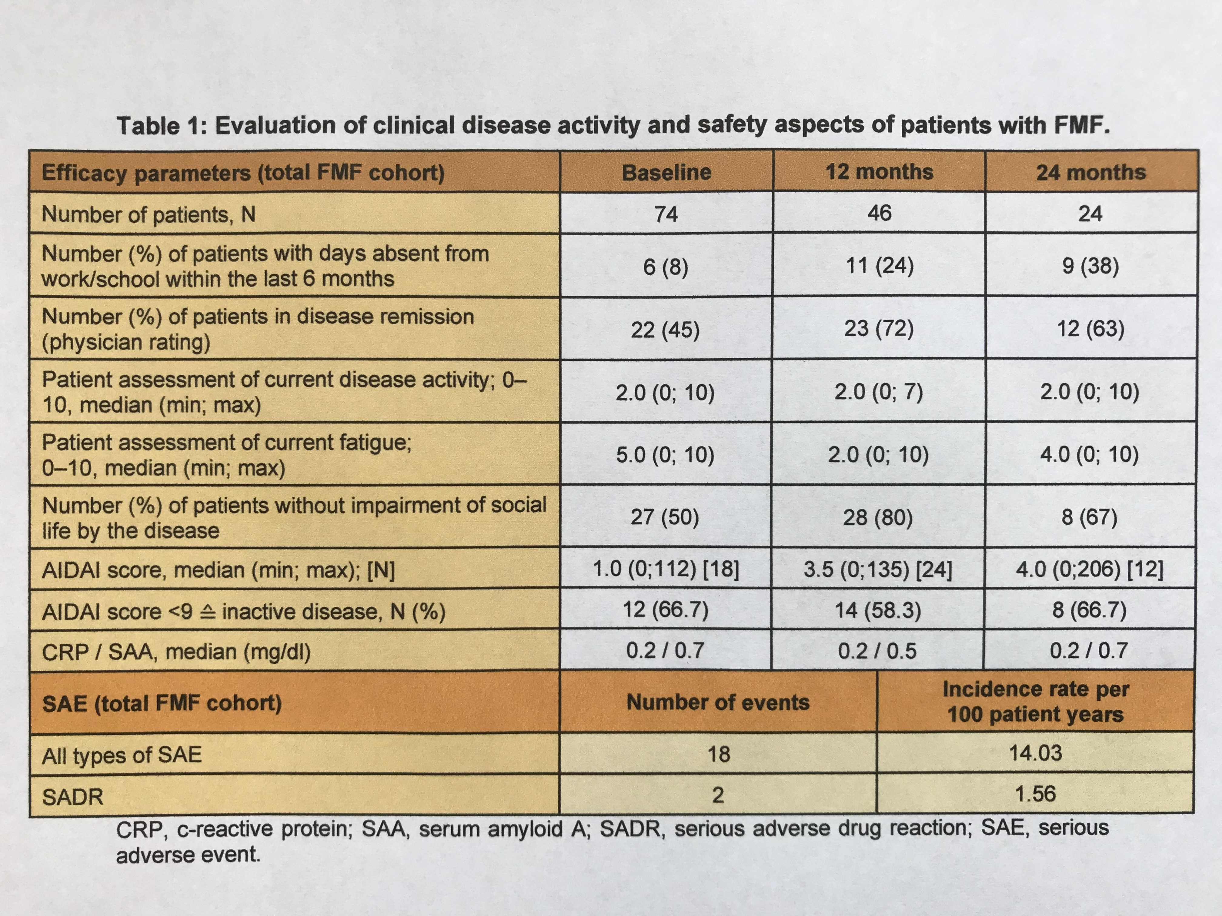 Table 1: Evaluation of clinical disease activity and safety aspects of patients with FMF. Disclosures: J. Henes, Boehringer Ingelheim; J. Kuemmerle-Deschner, AbbVie/Abbott, Novartis, SOBI; T. Krickau, Novartis; T. Kallinich, Roche; F. Dressler, Novartis, AbbVie/Abbott, Mylan, Pfizer; G. Horneff, Roche, Pfizer, Novartis, Merck/MSD, Eli Lilly, AbbVie/Abbott; F. Meier, Novartis; I. Foeldvari, None; F. Weller-Heinemann, None; B. Kortus-Goetze, Novartis; M. Hufnagel, Novartis; J. Rech, Novartis, SOBI, AbbVie/Abbott, Biogen, Bristol-Myers Squibb(BMS), Chugai, GlaxoSmithKlein(GSK), Janssen, Eli Lilly, Merck/MSD, Mylan, Roche, Sanofi, UCB; P. Oommen, Novartis; J. Weber-Arden, Novartis; N. Blank, Novartis, SOBI, Lilly, Pfizer, AbbVie/Abbott, Bristol-Myers Squibb(BMS), Merck/MSD, Actelion, UCB, Boehringer-Ingelheim, Roche.