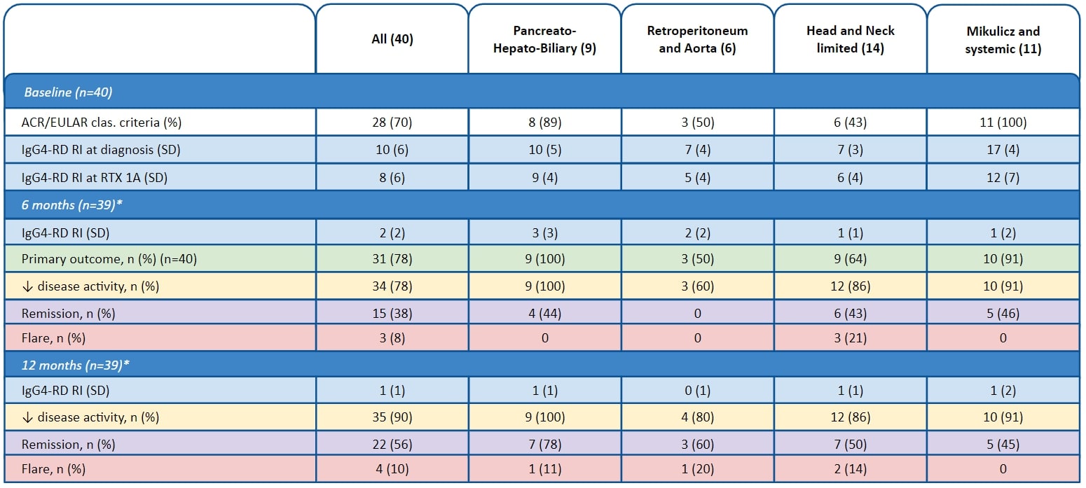 Methods: This is an open-label non-randomized single center observational study. All patients with IgG4-RD (diagnosed by expert opinion) at the Oslo University Hospital treated with ≥ 1 dose of RTX with 12 months follow-up were included. Two experts (JV, ØMi) assigned patients to phenotypes. Glucocorticoid (GC) treatment was allowed. We measured disease activity by the IgG4- RD Responder Index (IgG4-RD RI) at baseline, 6 months, and 12 months. We defined a composite primary outcome consisting of two measures; (i) reduced disease activity (i.e., ≥2 points improvement in IgG4-RD RI from baseline and/or IgG4-RD RI score 0 at follow-up), and (ii) no disease flares (i.e., no ≥2 points worsening of IgG4-RD RI and no need to increase GC dose) at 6 months. Secondary outcomes were (a) reduced disease activity at months 6 or 12, (b) remission (IgG4-RD RI score 0 and GC dose ≤ 7.5 mg) at 6 or 12 months and (c) safety. Descriptive statistics were applied.