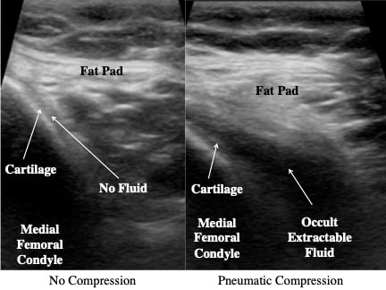 Ultrasound Image of Non-Effusive Knee with and without Pneumatic Compression (medial knee). The figure on the left is the flexed non-effusive knee, where the needle cannot access the synovial fluid because the fat pad (Fat Pad) forces fluid from the surface of the cartilage to the superior knee. The figure on the right is a non-effusive knee with the pneumatic compression that compresses the suprapatellar bursa and induces collapse driving the occult synovial fluid (Occult Extractable Fluid) inferiorly where the fluid collects over the cartilage surfaces (Cartilage) of the medial femoral condyle (Medial Femoral Condyle) displacing the fat pad (Fat Pad). The needle can then access the synovial fluid (Occult Extractable Fluid).
