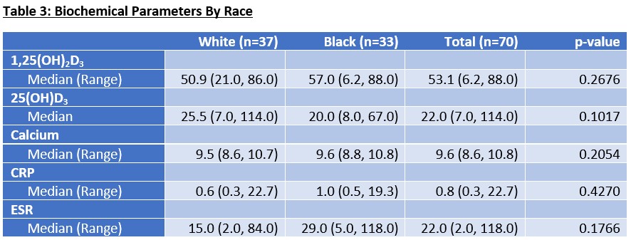 Reference ranges: 1,25(OH)2D3 19.9-79.3 pg/mL; 25(OH)D3 ≥20ng/mL; Calcium 8.6-10.6 mg/dL; CRP < 8.0mg/L; ESR 0-20mm/H