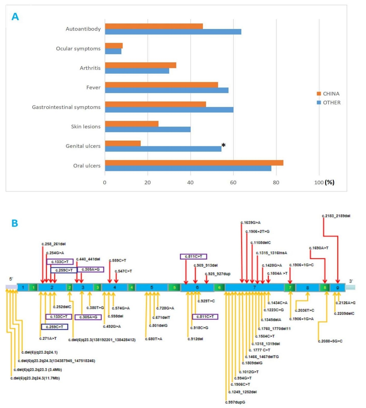 Fig 3. A: Comparison of clinical phenotypes of HA20 patients in China and other populations. *: P < 0.05. B: The locations of variants in the TNFAIP3 gene. The red arrows represent the locus of variants in the Chinese (20). The orange arrows represent the locus of variants from other populations (41). The purple boxes represent co-owned variants (4).