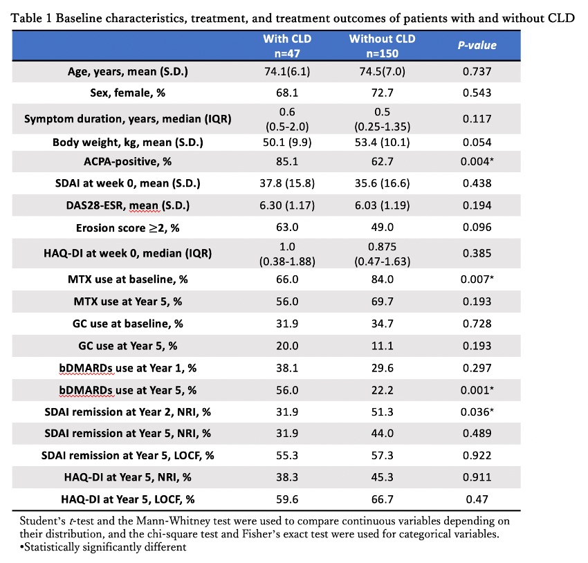Results: Among 197 patients with EORA, 47 patients had CLD (ILD, n=31; airway disease, n=12; emphysema, n=11; others, n=2) (Table 1). The proportion of MTX use at baseline was significantly lower in patients with CLD than those without, but there was no significant difference between the groups at Year 5. The proportion of bDMARDs use was higher in patients with CLD than those without at Year 5 (Table 1). There was no significant difference between the groups in SDAI remission and HAQ-DI ≤ 0.5 at Year 5 (Table 1). The drop-out rate at Year 5 was not significantly different between the two groups. The cumulative probability of SAEs was 73.6% and 36.6% in those with and without CLD, respectively (p < 0.001).