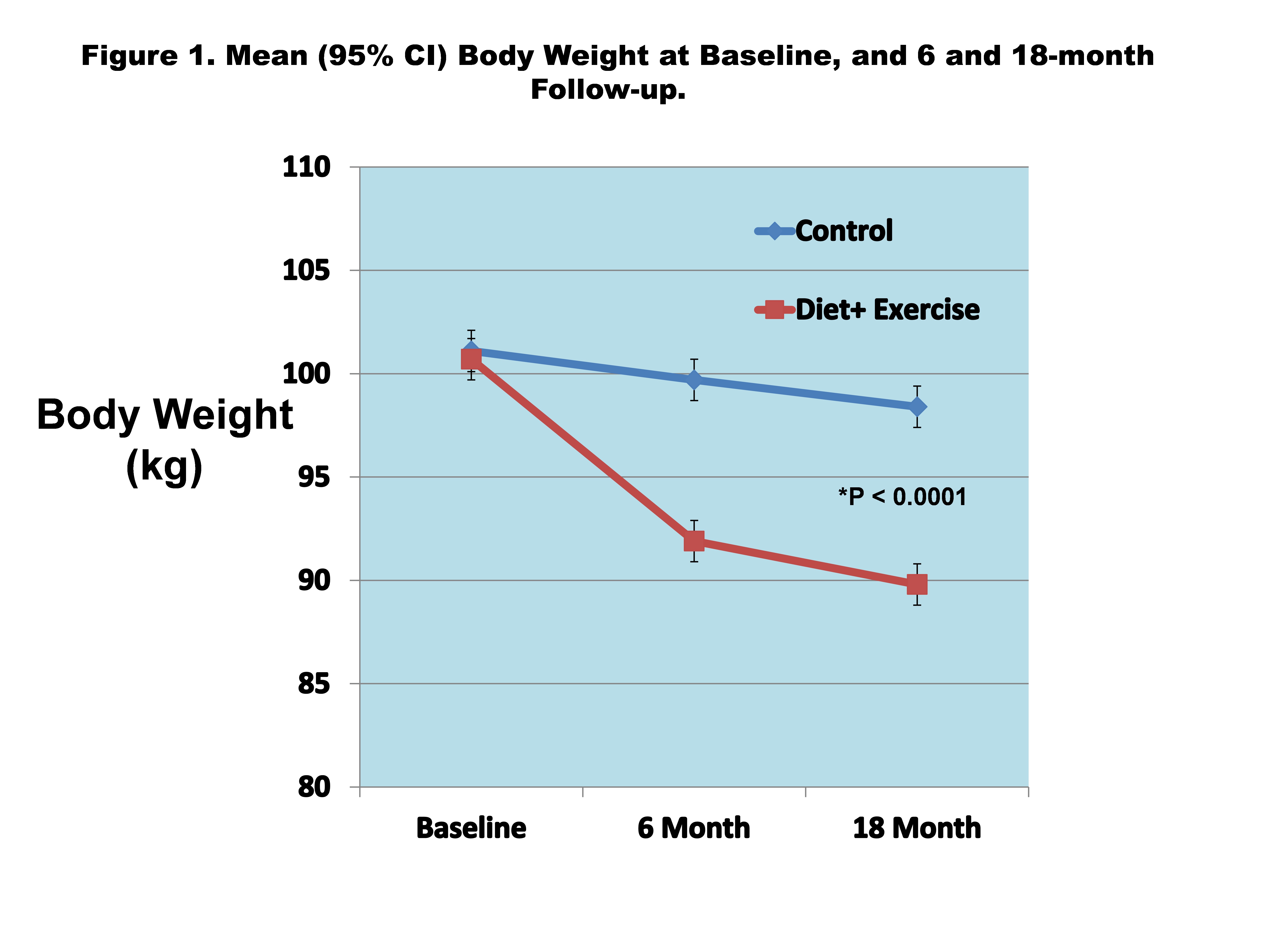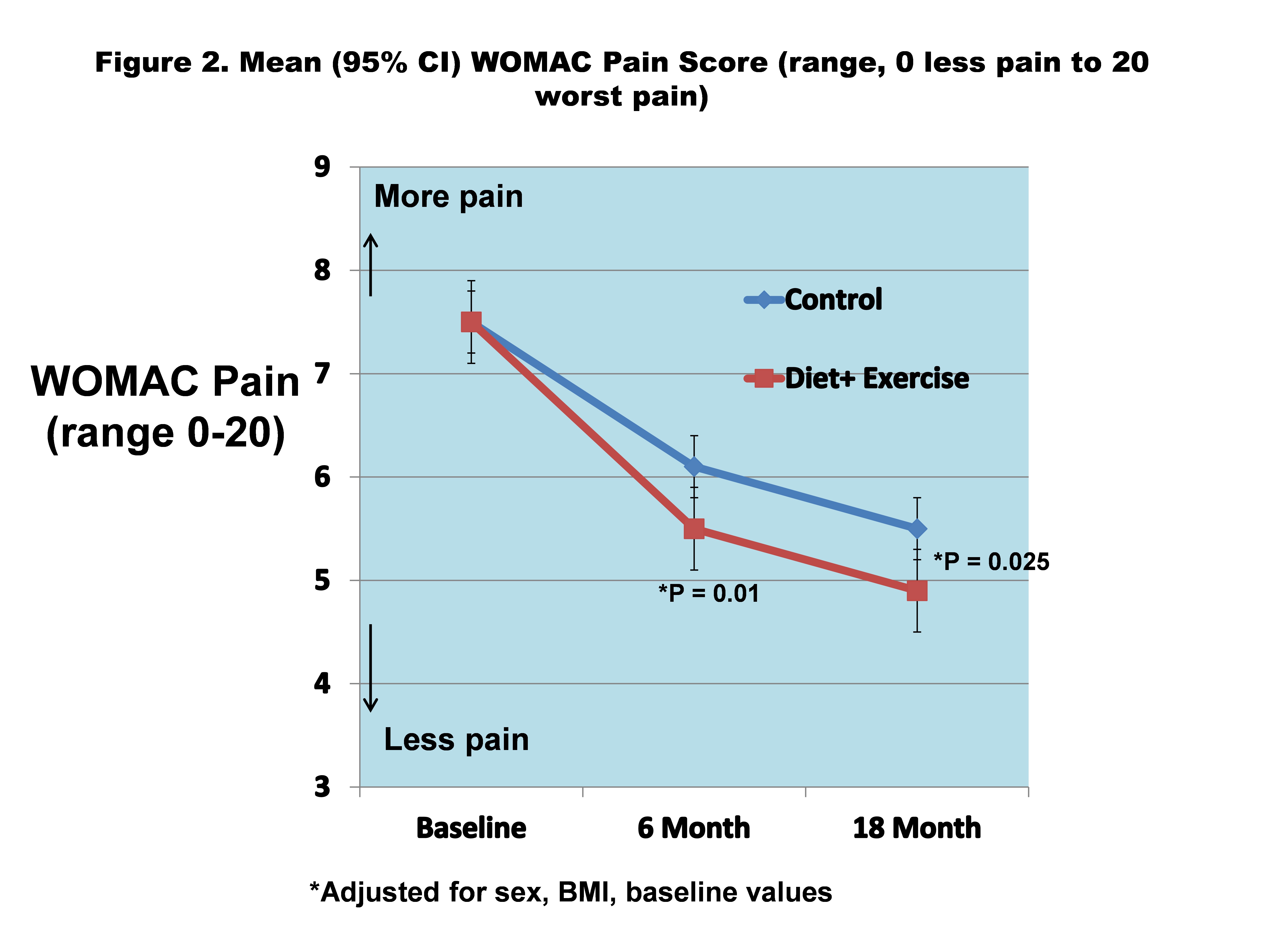 The difference in mean 18-month body weight between D+E and C was 10.9 kg(10.8%) vs 2.7 kg(2.7%), difference, 8.6; 95%CI, 5.4 to 11.9, P< .0001 (Figure 1). Mean 18-month WOMAC pain was significantly less for D+E vs C (4.9 vs 5.5; adjusted difference, -0.6; 95%CI, -1.0 to -0.1; P=.025) (Figure 2). D+E also had significantly improved WOMAC function (16.4 vs 19.7; adjusted difference, -3.3; 95%CI, -4.9 to -1.7; P< .0001), greater 6-minute walk distance (419 m vs 376 m; adjusted difference, 43; 95%CI, 31 to 55; P< .0001), and greater SF-36 physical health related quality of life compared to the C group (41.3 vs 37.5, adjusted difference, 3.8; 95% CI, 2.5 to 5.2, P< .0001).