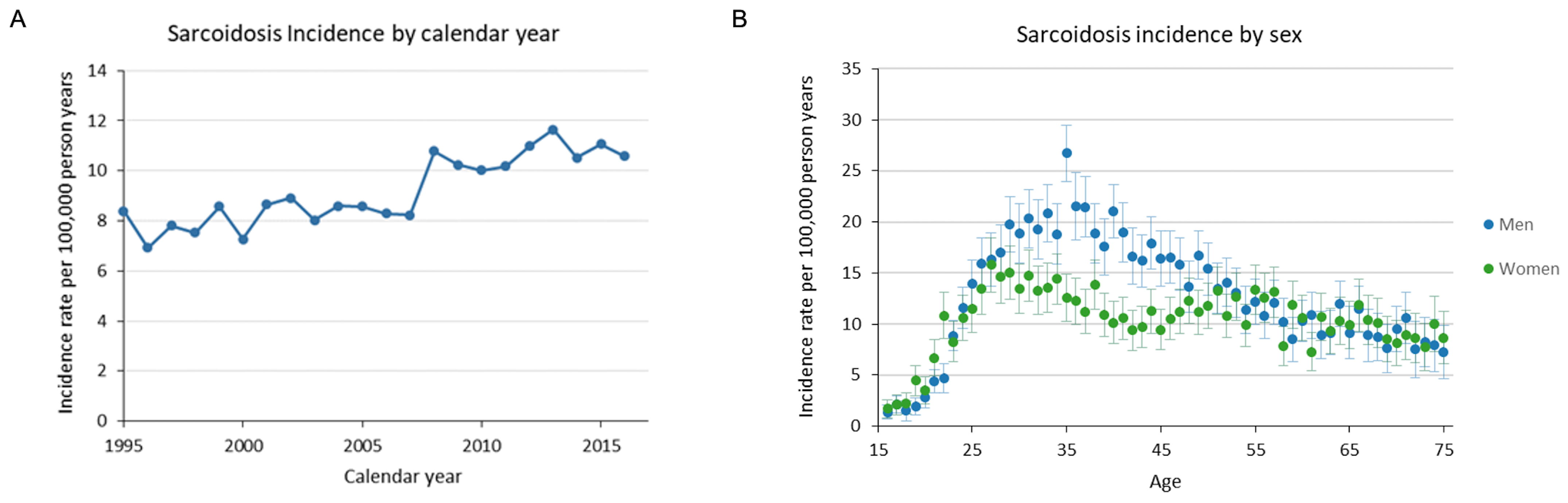 Figure 1: Sarcoidosis incidence rate by year (A) and by sex (B).