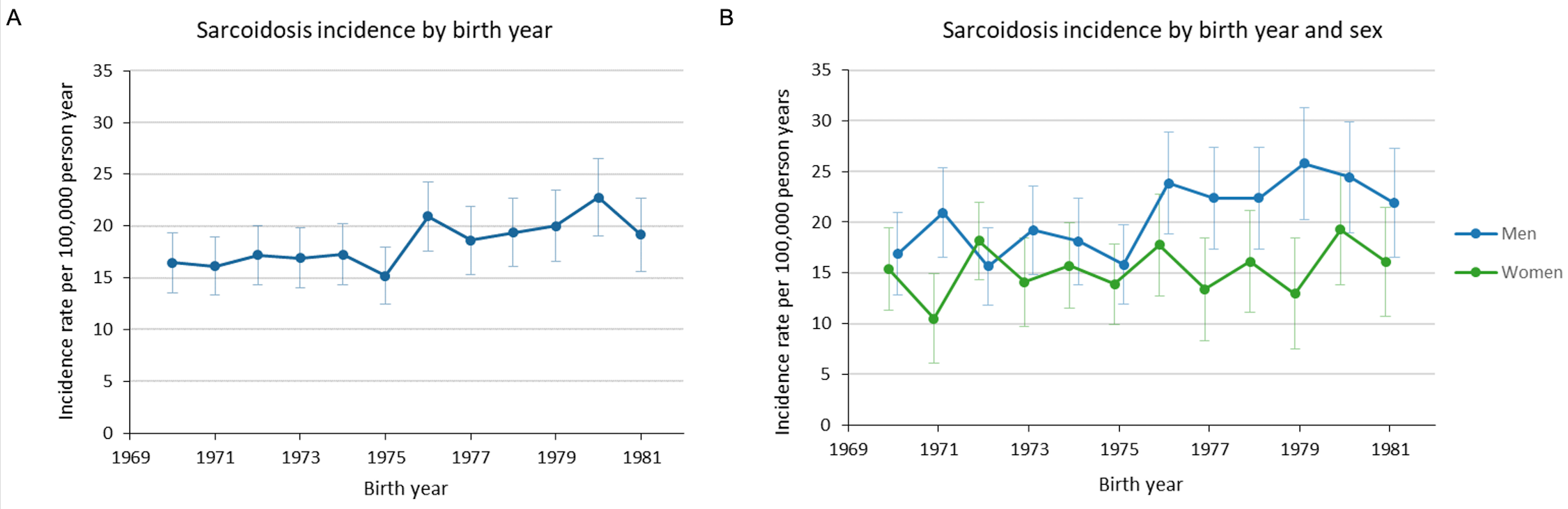 Figure 2: Incidence rate of sarcoidosis by birth year between age 25-35 (A) and by birth year and sex between age 25-35 (B).