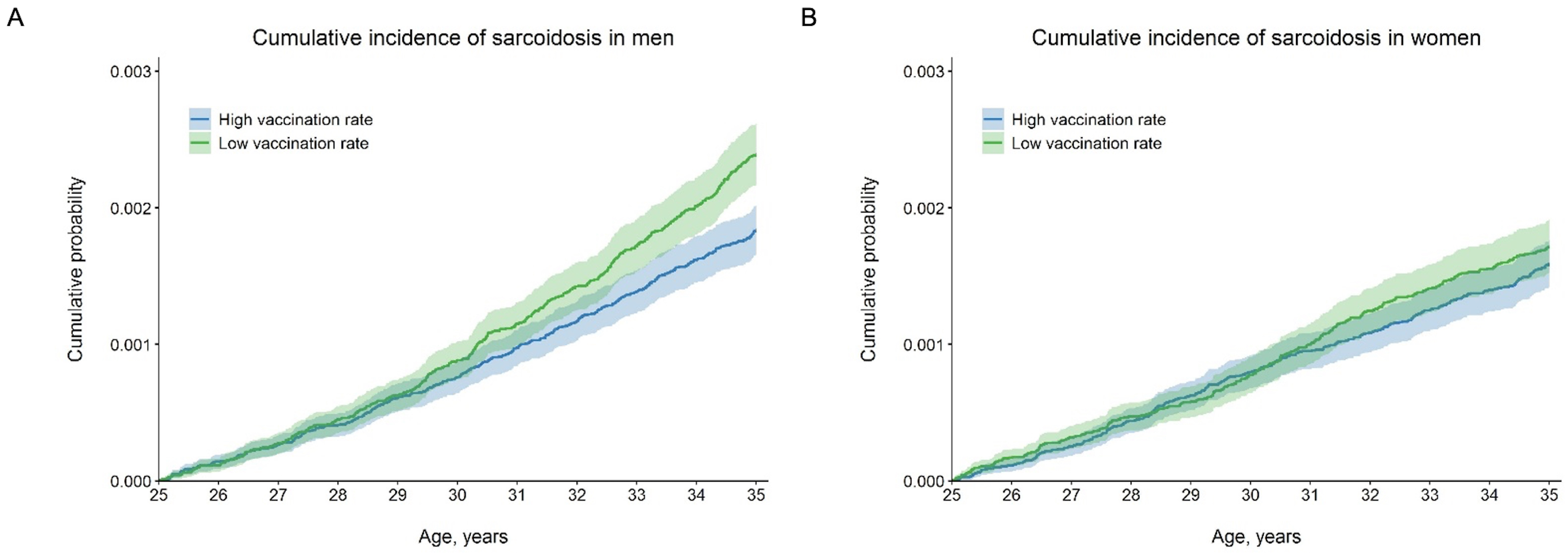 Figure 3: Cumulative incidence probability of sarcoidosis in men (A) and women (B).
