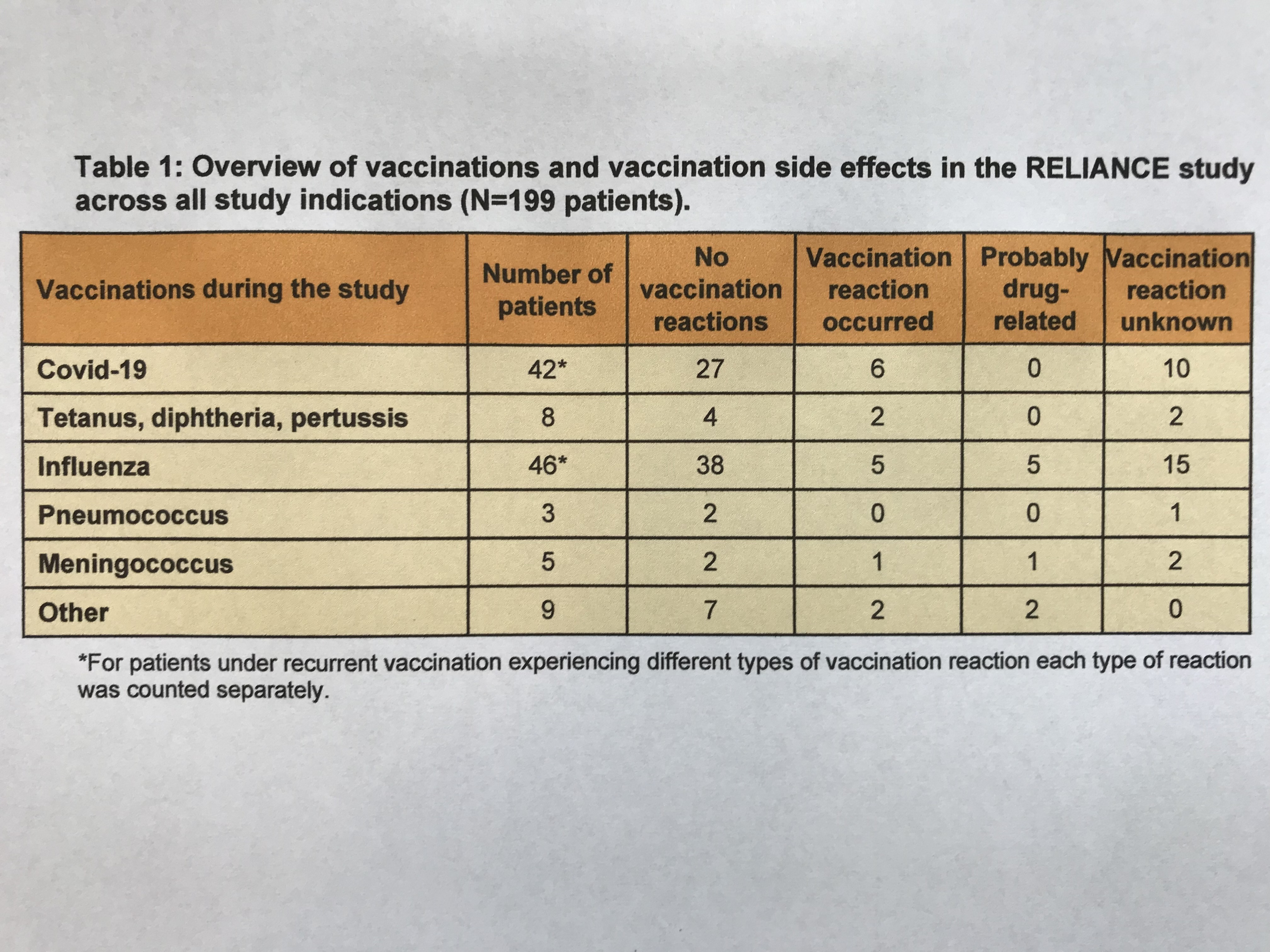 Table 1: Overview of vaccinations and vaccination side effects in the RELIANCE study across all study indications (Nf199 patients). Disclosures: J. Kuemmerle-Deschner, AbbVie/Abbott, Novartis, SOBI; J. Henes, Boehringer Ingelheim; B. Kortus-Goetze, Novartis; T. Kallinich, Roche; P. Oommen, Novartis; J. Rech, Novartis, SOBI, AbbVie/Abbott, Biogen, Bristol-Myers Squibb(BMS), Chugai, GlaxoSmithKlein(GSK), Janssen, Eli Lilly, Merck/MSD, Mylan, Roche, Sanofi, UCB; T. Krickau, Novartis; F. Weller-Heinemann, None; G. Horneff, Roche, Pfizer, Novartis, Merck/MSD, Eli Lilly, AbbVie/Abbott; A. Janda, None; I. Foeldvari, None; C. Schuetz, Novartis; F. Dressler, Novartis, AbbVie/Abbott, Mylan, Pfizer; M. Borte, Pfizer, Shire; M. Hufnagel, Novartis; F. Meier, Novartis; M. Fiene, None; J. Weber-Arden, Novartis; N. Blank, Novartis, SOBI, Lilly, Pfizer, AbbVie/Abbott, Bristol-Myers Squibb(BMS), Merck/MSD, Actelion, UCB, Boehringer-Ingelheim, Roche.