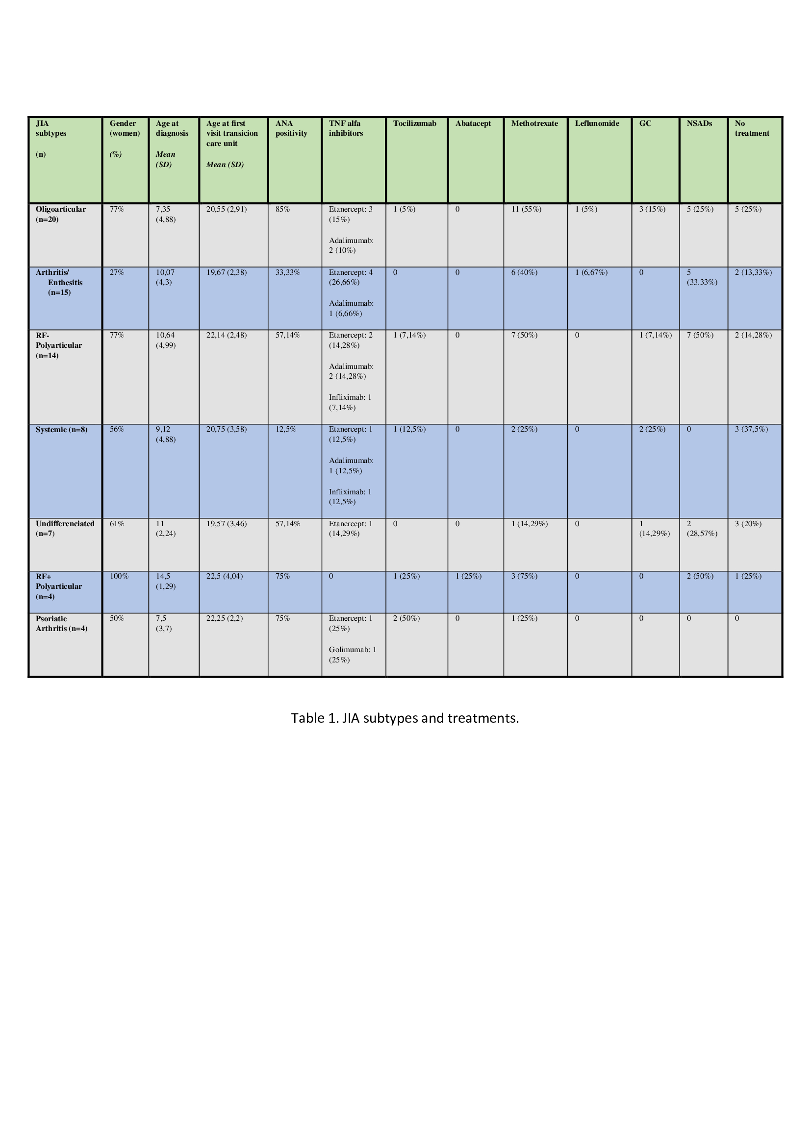 Results: 72 patients were included (46 women), mean age at diagnosis of 9.5 ± 4.6y and a mean of 11.3 ± 4.36y from diagnosis to first visit at the transitional care unit. 27.7% were diagnosed with oligoarticular JIA, 20.8% with arthritis-enthesitis JIA, 19.4% with Rheumatoid Factor negative (RF-) polyarticular JIA, 11.1% with systemic JIA, 9.7% with undifferentiated JIA, 5.5% with Rheumatoid Factor positive (RF+) polyarticular JIA and 5.5% of psoriatic arthritis. The mean age at the first visit to the transitional care unit was 20.81 ± 2.96y (no differences between subtypes). Oral ulcers (20.8%), anterior uveitis (13.8%), and enthesitis (13.8%) were the most frequent extra-articular manifestations. 56.9% had antinuclear antibodies (ANA) titers >1/160 at some point in course of the disease. 43% were treated with methotrexate, 38% with biological therapies, 11.% with glucocorticoids (GC) and 22.% had no treatment (Table).