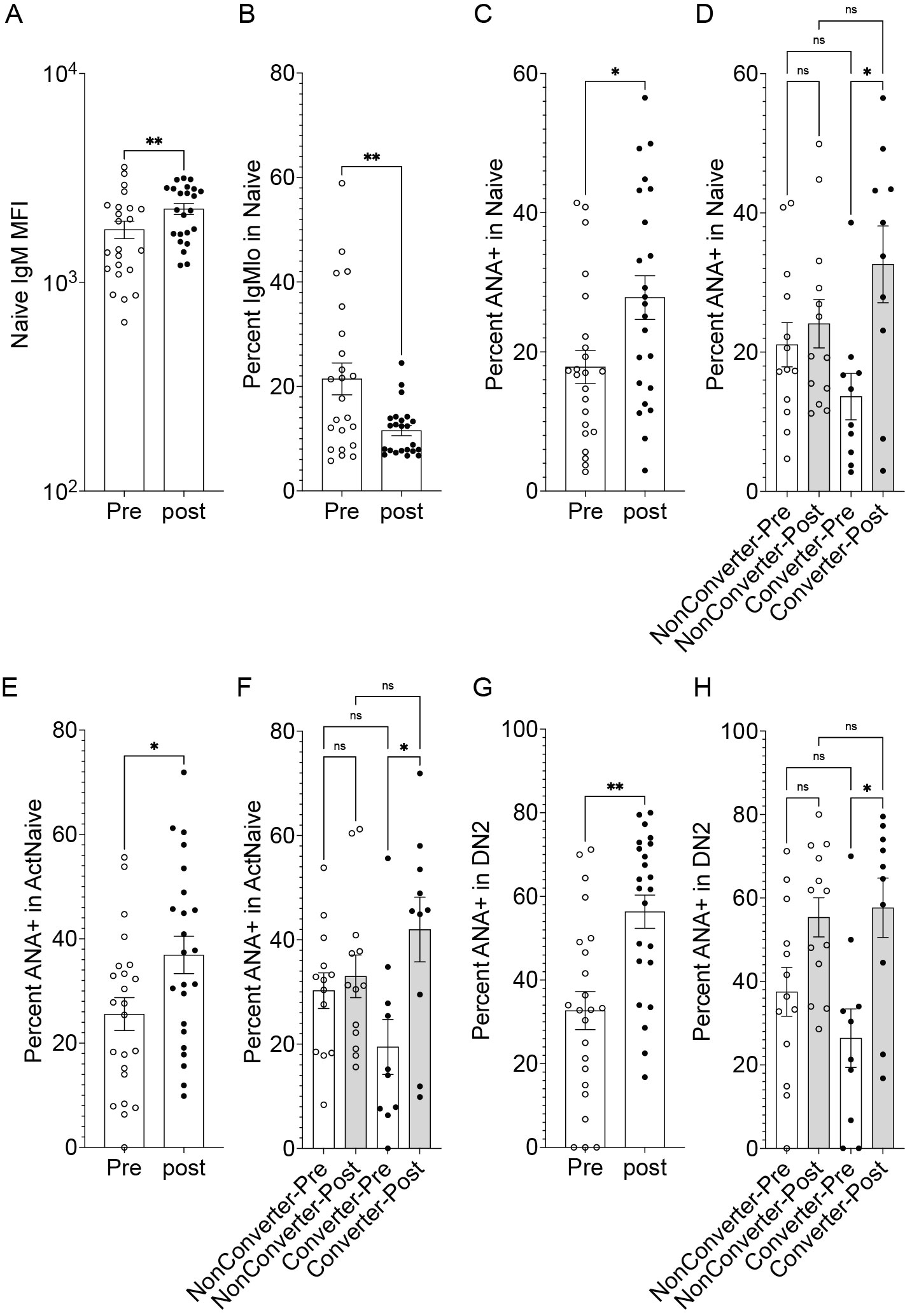 Figure 1: Plots show summarized data from flow cytomerty. A. Median fluorescent intensity of surface IgM on naïve B cells. B. Percent of IgMlo B cells in the Naïve B cell compartment. C-H. Percent of ANA+ B cells in Naïve, Activated Naïve, and DN2 B cell compartments.