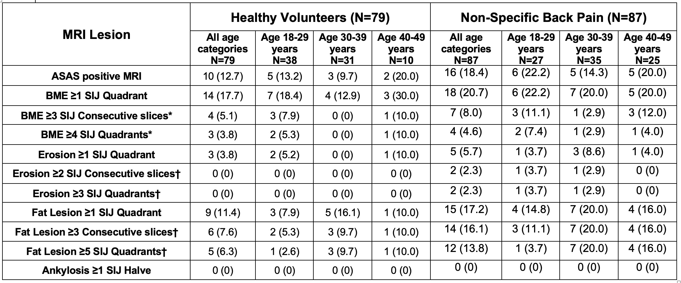 Table 1. Number (%) of Healthy Individuals Without Back Pain and Non-Specific Back Pain Patients with MRI SIJ Lesions According to ASAS Definitions and Majority of Readers. *MRI cut-offs for positive MRI indicative of active lesion typical of axSpA †MRI cut-offs for positive MRI indicative of structural lesion typical of axSpA