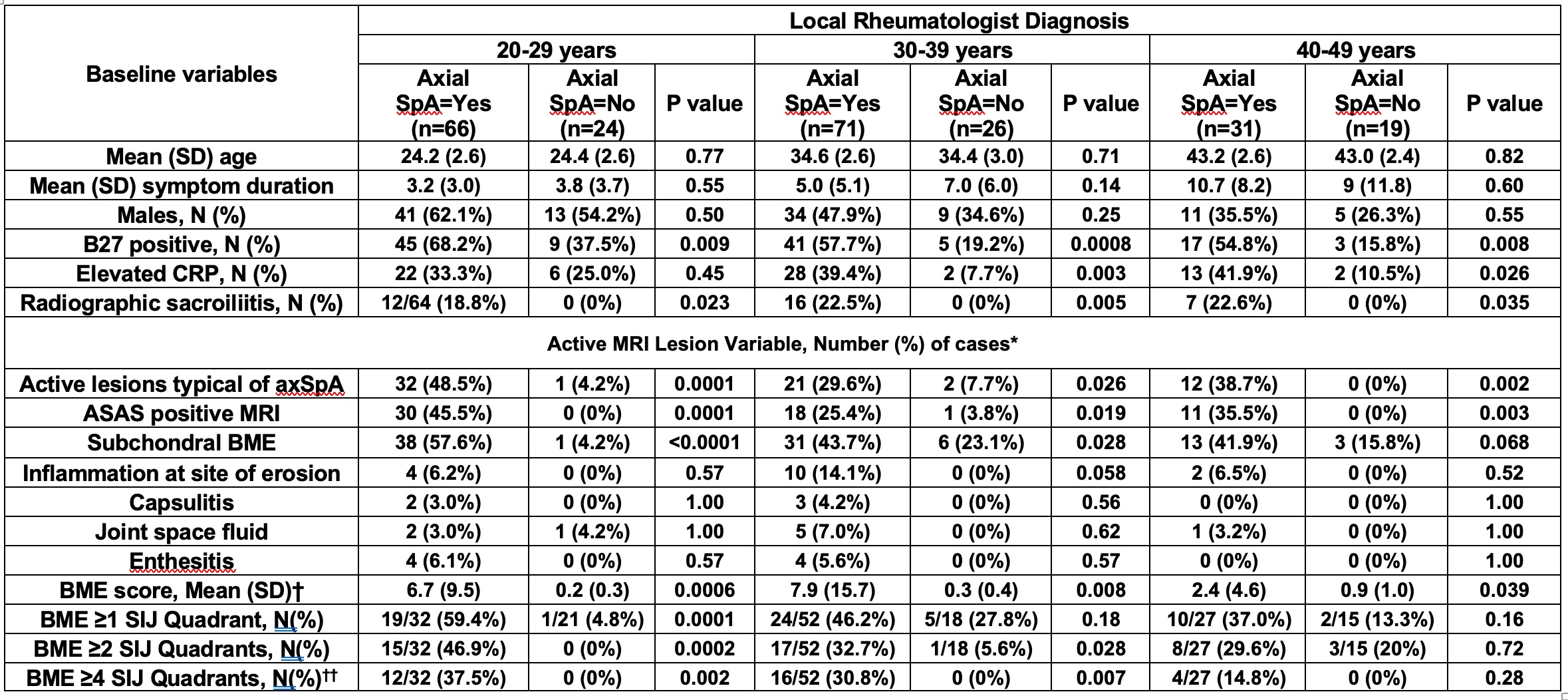 Table 2. Frequencies of active MRI lesions in the SIJ Recorded by 7 ASAS-MRI Central Readers According to Local Rheumatologist Diagnosis of AxSpA or NSBP in Consecutive Patients presenting with Undiagnosed Back Pain in the ASAS Classification Cohort. *Based on majority reader (≥4/7) agreement †Based on mean of 7 readers ††MRI cut-off for positive MRI indicative of active lesion typical of axSpA