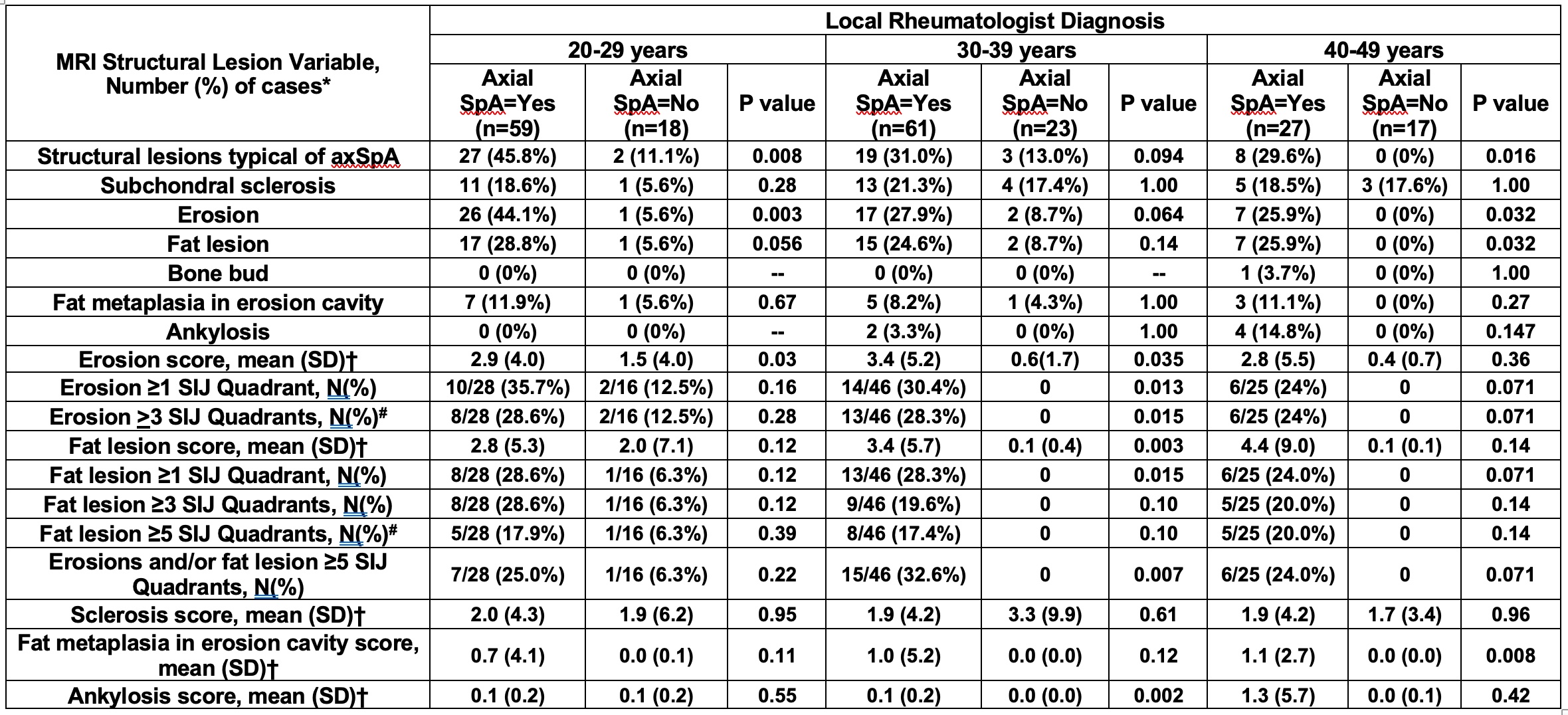 Table 3. Frequencies of structural MRI lesions in the SIJ Recorded by 7 ASAS-MRI Central Readers According to Local Rheumatologist Diagnosis of AxSpA or NSBP in Consecutive Patients presenting with Undiagnosed Back Pain in the ASAS Classification Cohort. *Based on majority reader (≥4/7) agreement. †Based on mean of 7 readers #MRI cut-offs for positive MRI indicative of structural lesion typical of axSpA