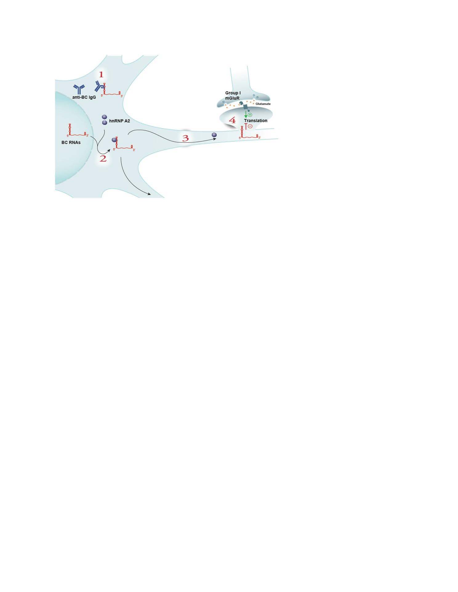 Figure 1. SLE anti-BC abs: molecular – cellular mode of action. SLE anti-BC abs target transport-specifying DTEs in BC RNA (here represented by rodent BC1 RNA) 5’ stem-loop domains (Scene 1), thereby preventing association of transport factor hnRNP A2 with such DTEs (which occurs normally in the absence of SLE anti-BC abs; Scene 2). Dendritic delivery of BC RNAs (Scene 3) is thus compromised by SLE anti-BC abs. Lack of BC RNAs at the synapse results in dysregulation of local translational control (Scene 4), causing synaptic hyperexcitability (due to unbalanced and therefore excessive group I metabotropic glutamate receptor stimulation of local translation) and con¬sequential phenotypic alterations.