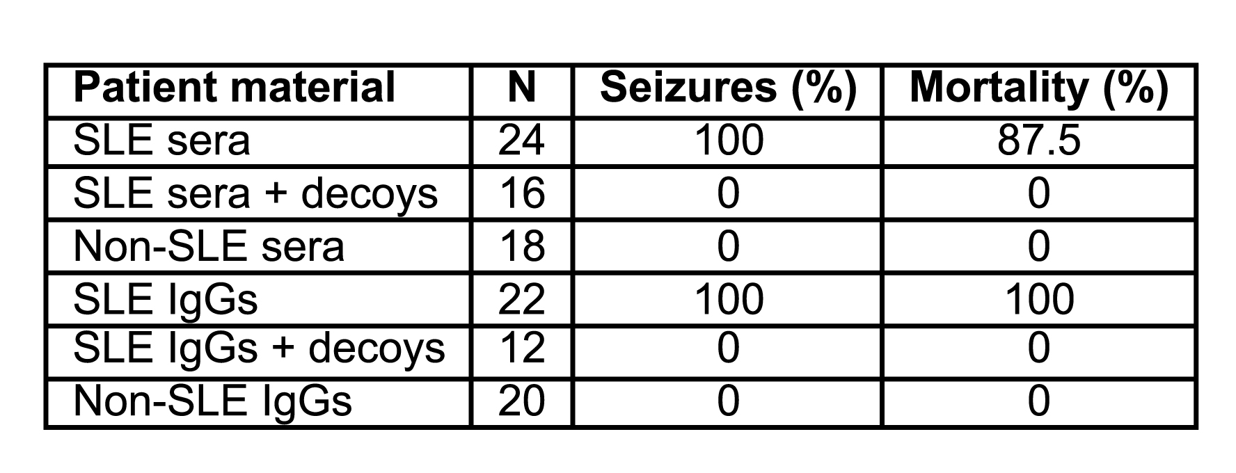 Table 1. Seizure susceptibility and mortality of wild-type mice injected with lupus or non-lupus sera or purified IgGs. Animals were subjected to 120-dB auditory stimulation for 15 min (or until death, if occurring earlier). Patient material is defined as follows. SLE sera/IgGs, sera/IgGs from SLE patients with seizures; non-SLE sera/IgGs, sera/IgGs from patients with rheumatoid arthritis or multiple sclerosis, and from heathy subjects. N, number of animals.