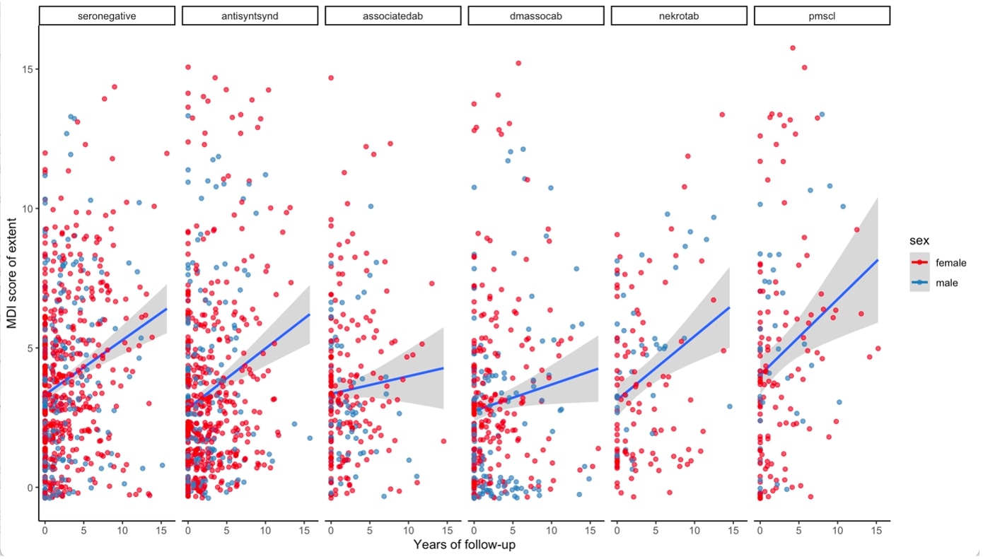 Conclusion: Our study is the first to describe patterns and trajectories of change of damage over time in relation to autoantibody status in a large international multicenter cohort of patients with IIM. These findings indicate that the autoantibody status is useful as predictor of organ damage in these patients. Figure 1. Predicted trajectories of the MDI score of extent by the autoantibody-defined groups and by sex in patients with idiopathic inflammatory myopathies. Legend. Each point represents a patient. The blue lines represent the predicted trajectory of the change on the MDI score of extent using linear regression. The grey shadow represents the confidence interval. Years of follow-up since the index date. NOTE: antisyntsynd: antisynthetase antibodies, associatedab: myositis associated autoantibodies without specific antiantibodies, dmassoc: dermatomyositis specific autoantibodies, nekrotab: immune mediated necrotizing autoantibodies.