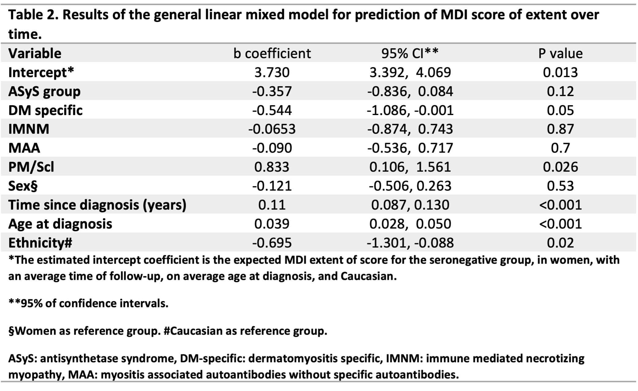 Methods: We conducted a longitudinal analysis using the EuroMyositis registry including patients classified as IIM (1) who were tested for autoantibodies and had at least 1 assessment of damage (Myositis Damage Index, MDI) (2) Patients were sub-grouped by their autoantibody status (Table 1). The primary outcome was the change on MDI extent of damage over the entire follow-up time (up to 16 years) analyzed by linear mixed models. The MDI score varies between 0-38, where 0 indicates no damage in 11 different organs, including malignancy and infection . We used the autoantibody status as independent variable of trajectories of change. The time point for the first MDI assessment registered was defined as the index date.