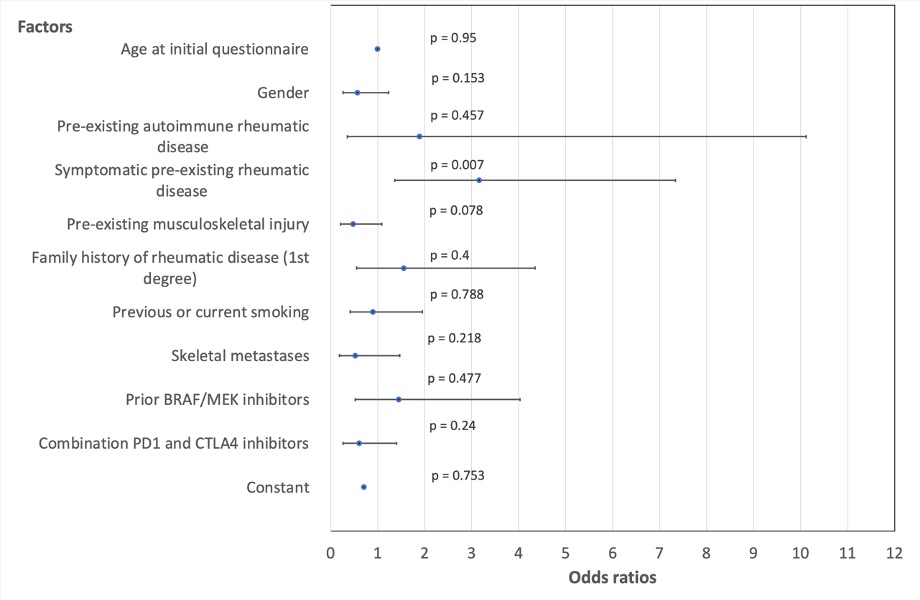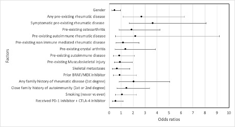 Figure 2: Forest plot of multivariate log odds ratios for predictors of rheumatic toxicities. Outcome variable defined as total patient-reported rheumatic disease derived from both cross-sectional and observational cohorts. BRAF/MEK, combination BRAF and MEK inhibitors; PD-1, Programmed Cell Death protein 1; CTLA-4, Cytotoxic T-lymphocyte-associated protein.
