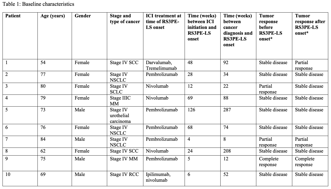 Abbreviations: ICI: immune checkpoint inhibitor, RS3PE-LS: Remitting Seronegative Symmetrical Synovitis with Pitting Edema (RS3PE)-like Syndrome, SCC: Squamous cell carcinoma, NSCLC: Non-small cell lung cancer, SCLC: Small cell lung cancer, MM: Malignant melanoma, RCC: renal cell carcinoma.