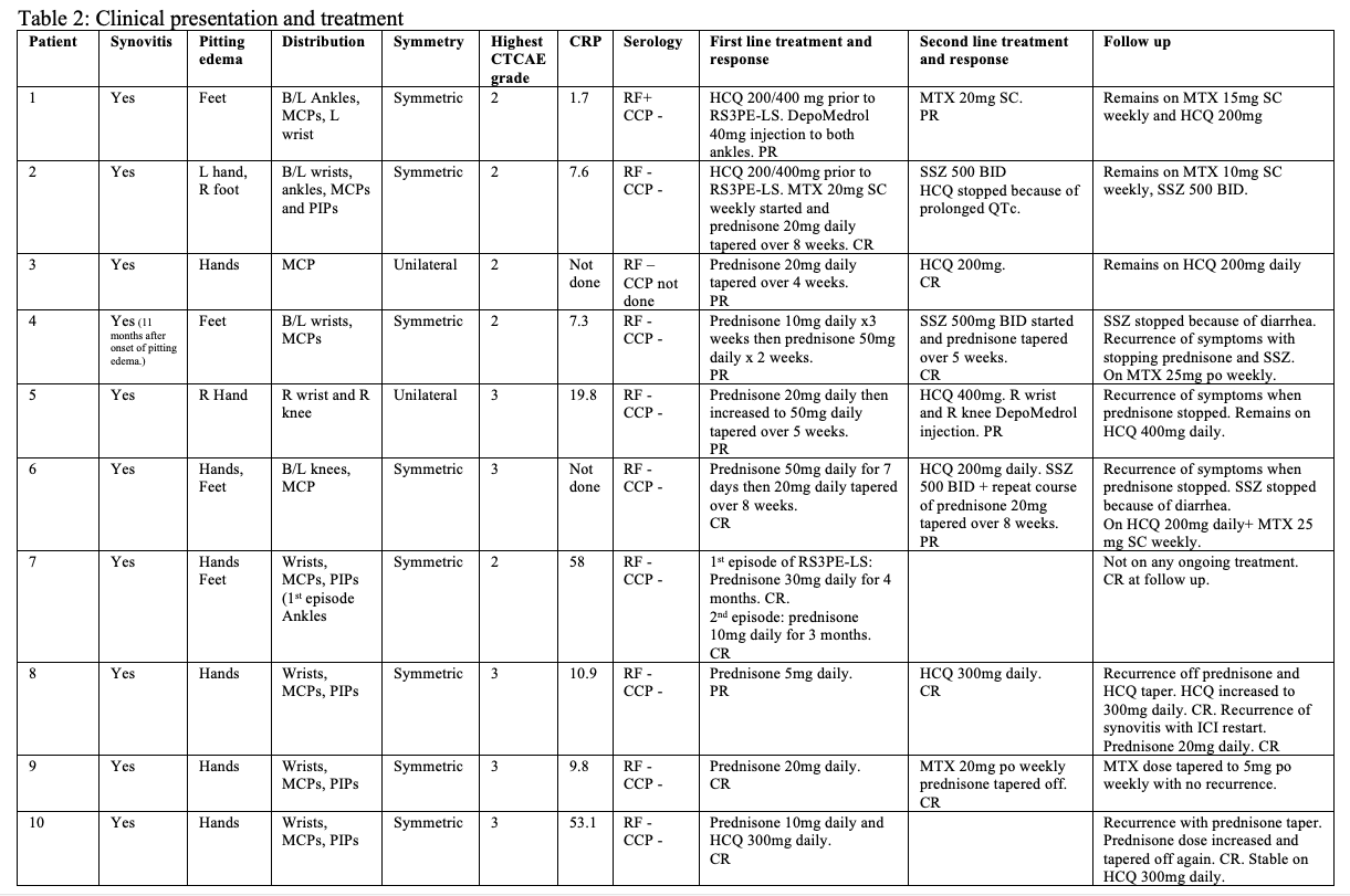 Abbreviations: CTCAE: Common Terminology Criteria for Adverse Events, CRP: C-reactive protein, B/L: Bilateral, L: left, R: Right, RF: rheumatoid factor, CCP: cyclic citrullinated peptide, SC: subcutaneous, RS3PE-LS: Remitting Seronegative Symmetrical Synovitis with Pitting Edema (RS3PE)-like Syndrome, HCQ (hydroxychloroquine), MTX (methotrexate), SSZ (Sulfasalazine), MCP: metacarpophalangeal, PIP: proximal interphalangeal, , CR: Complete response, PR: partial response.