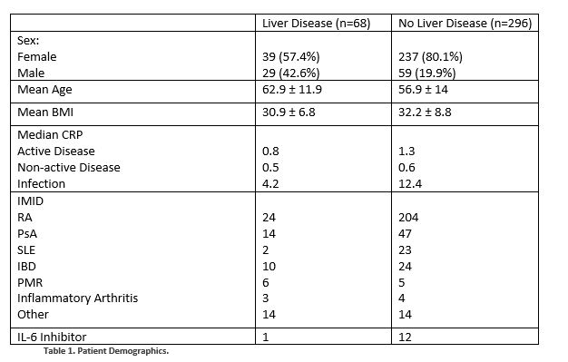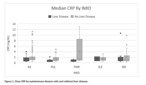 Figure 1. Flare CRP by autoimmune disease with and without liver disease.