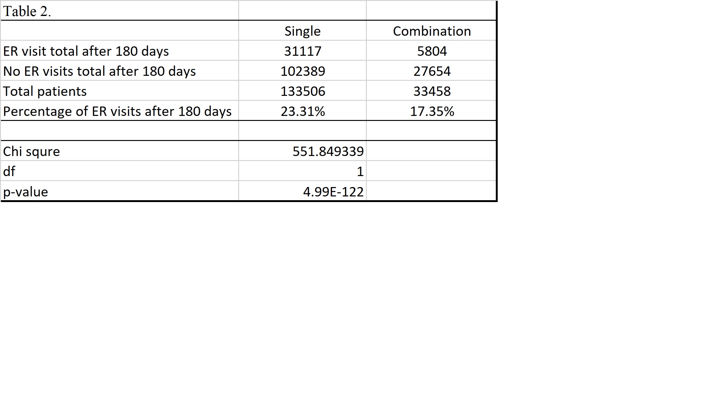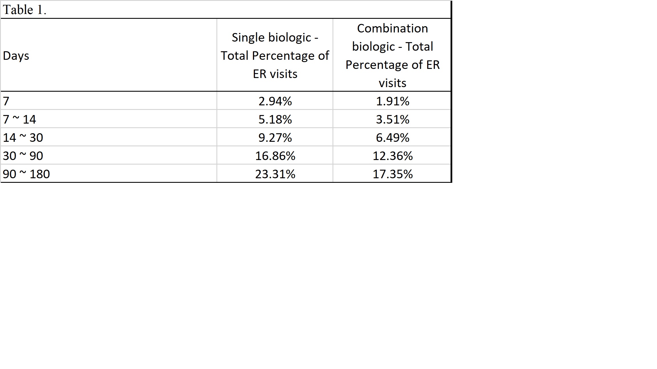 Source: Table 1. Percentage of ER visits in patients with single biologic or combination biologic treatments over 180 days.