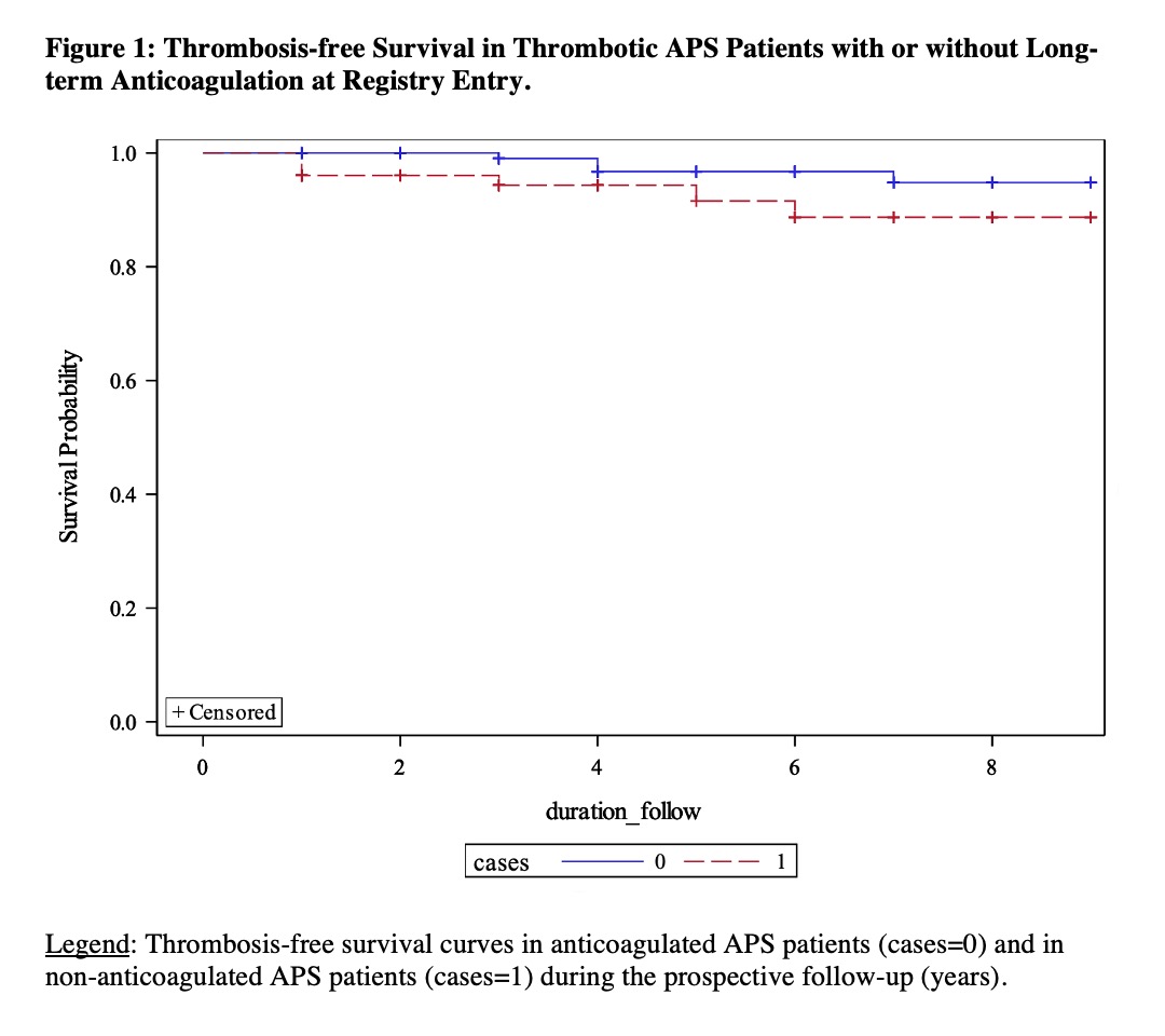 Results: As of May 2022, 662 TAPS patients were included in the registry. Ninety-one (14%) patients were not on anticoagulation at registry entry; 42/91 (46%) never received anticoagulation, while 49/91 (55%) had anticoagulation withdrawn before registry entry. Reasons for not receiving anticoagulation were known in 31 patients: provoked thrombosis with major transient risk factor (n=9), incidental finding (n=3), delayed APS diagnosis (n=4), thrombocytopenia (n=6), major hemorrhage (n=2), isolated retinal thrombosis (n=4), and patient's decision (n=3). We identified 144 matched-controls for 86 of the 91 not-anticoagulated patients (cases). Demographical and clinical characteristics of two groups were similar at registry entry except cases had a higher frequency of chronic renal disease, lower mean BMI, and were more likely to receive antiplatelet therapy. During the prospective follow-up, six cases and four controls had at least one thrombosis; the relapse rates (cases vs controls) were 4% vs zero and 8.4% vs 3.2% at 2-year and 5-year follow-up, respectively. Despite a trend, the thrombosis-free survival did not differ significantly between cases and controls: hazard ratio 0.324 95%CI (0.09; 1.16) p=0.084.