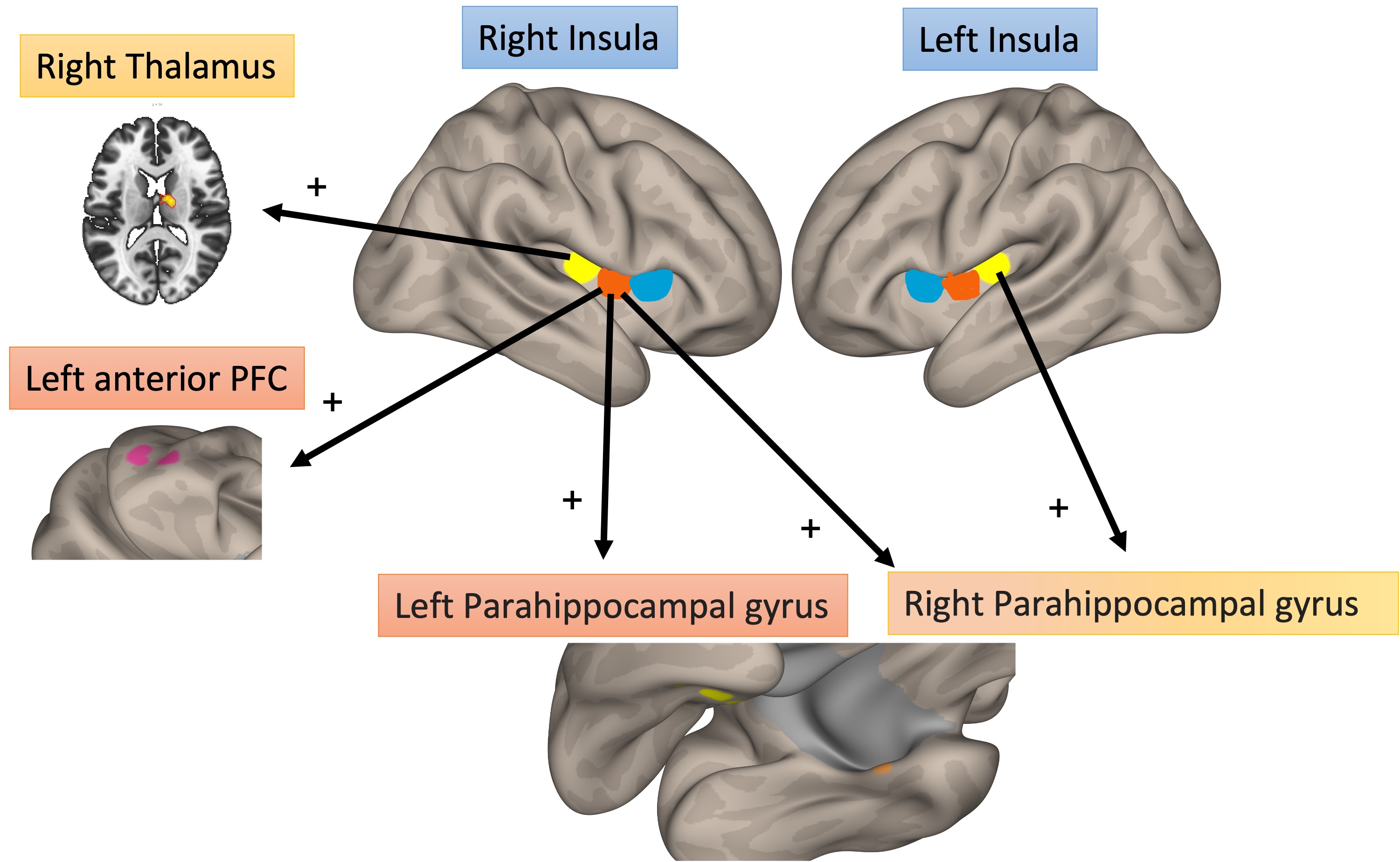 Location and connectivity to right and left insula cortices in PsA patients with higher degree of nociplastic pain. PFC, Prefrontal Cortex.