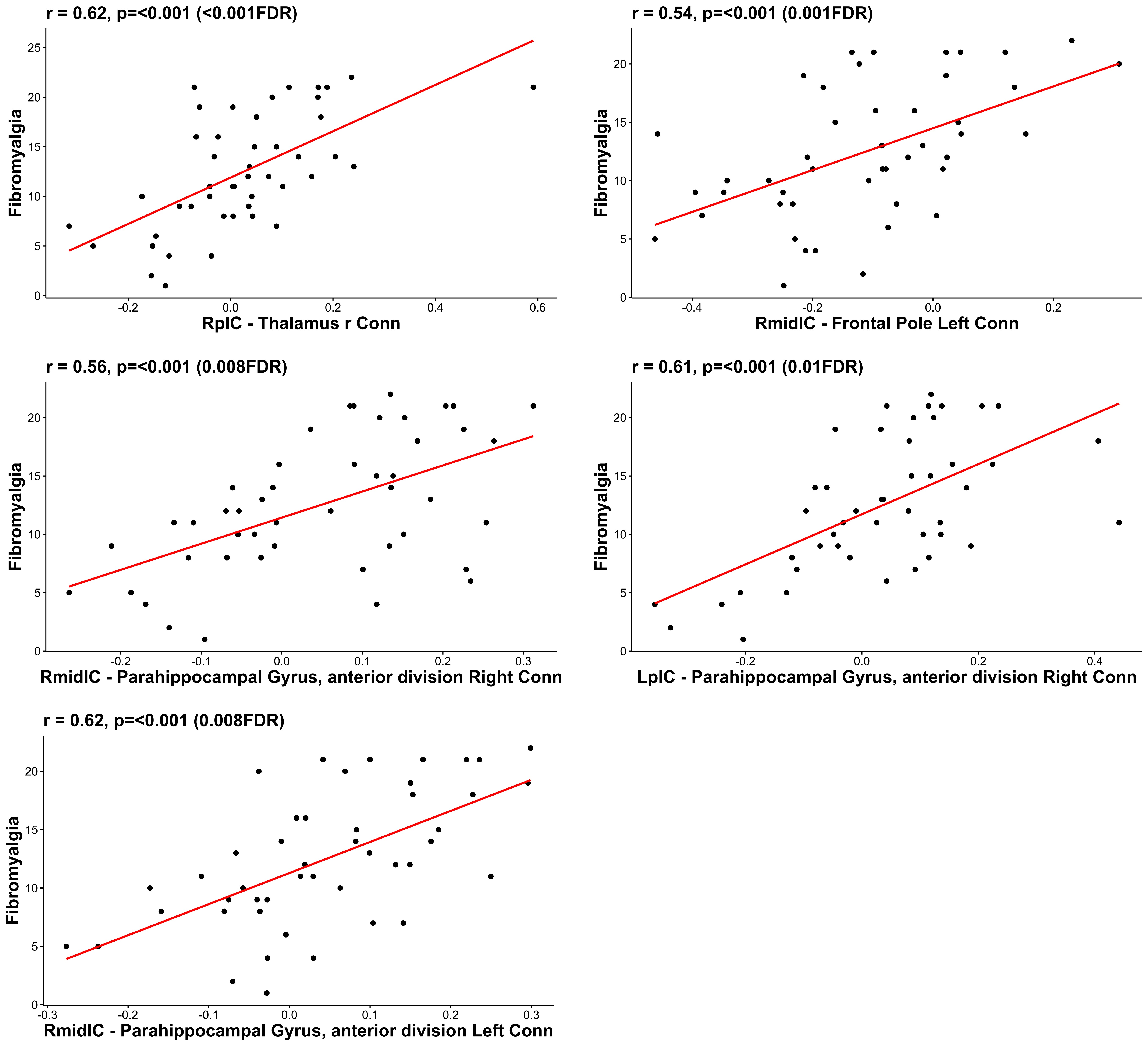 Pearson correlations between connectivity to Insula cortices and fibromyalgia score.