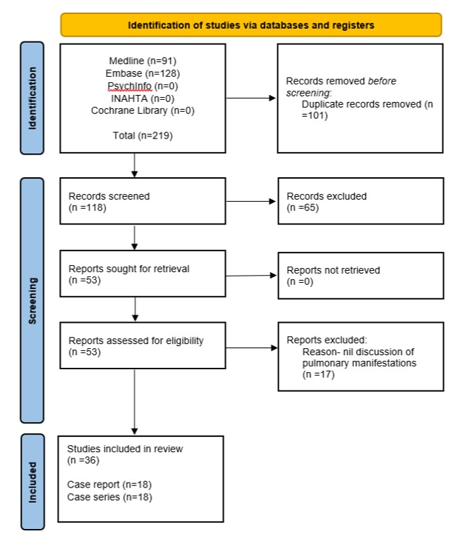 The research question was: What are the pulmonary manifestations in patients with VEXAS syndrome? The search was restricted to English-language articles and those discussing clinical presentation of disease. All article types were deemed eligible except opinion articles and reviews.