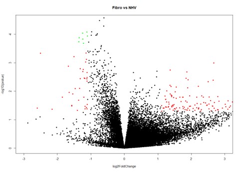 Conclusion: Next generation sequencing of RNA isolated from whole blood samples identified several genes that were differentially regulated in fibromyalgia patients versus those with other rheumatologic conditions. Using these data in the development of diagnostic algorithms may be a promising approach in distinguishing among diseases that have overlapping symptomology with fibromyalgia. Future studies using an orthogonal technology will be used to further validate the utility of the gene signature presented herein. Figure 1. Volcano plot illustrating RNA transcripts differentially expressed (log2-fold changes) between 14 normal health donors (NHVs; x-axis) and 26 fibromyalgia (fibro; y-axis) patients. Red colored dots indicate transcripts that were differentially expressed with p-values < 0.05, and green dots indicate those with p-adjusted values of < 0.1. Disclosures: L. Kolb, Exagen; M. Rudolph, Exagen, Inc; A. Kivitz, Amgen, Boehringer-Ingelheim, Janssen, Gilead, GlaxoSmithKlein (GSK), Novartis, Pfizer, Sanofi, Flexion, Eli Lilly, Genentech, UCB, AbbVie, Merck, ECOR1 CAPITAL, LLC, Chemocentryx, Regenerson, Grunenthal, Bendcare, Horizon; S. Rey, Exagen Inc.; R. Alexander, Exagen Inc.; A. Kammesheidt, Exagen Inc.; G. Stephens, Exagen Inc.