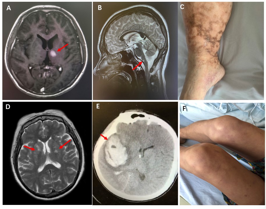 Figure 1: Clinical manifestations of DADA2 patients. A: Brain MRI of Patient 1 showed ischemic infarct at the thalamus (red arrow); B: Brain MRI of Patient 1 revealed ischemic infarct at the medulla oblongata (red arrow); C: Livedo reticularis and vasculitis rash on the lower limbs of Patient 2 with scarring and pigmentation; D: Brain MRI of Patient 2 showed multiple lacunar infarcts in bilateral basal ganglia (red arrow); E: Head CT of Patient 3 showed massive hemorrhage in the right temporal lobe (red arrow); F: Livedo reticularis on the lower limbs of Patient 3