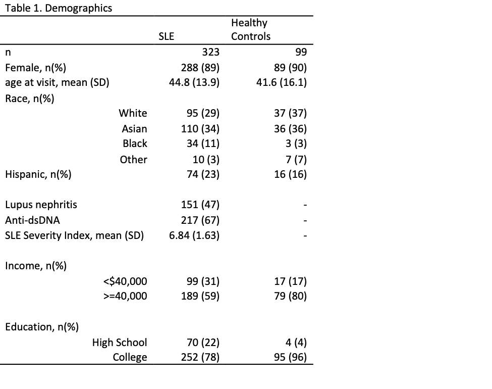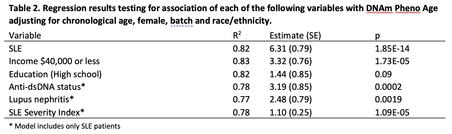 Results: Accelerated aging was associated with SLE status (βSLE=6.3, p=1.85E-14), adjusting for chronological age, sex race/ethnicity and batch. Among SLE patients, accelerated age was associated with anti-dsDNA status (βanti-dsDNA=3.19, p=0.0002), lupus nephritis (βLN=2.48, p=0.0019) and SLE severity index (βsevere=1.10, p=1.09E-05). Accelerated aging was associated with income less than $40,000 (βincome=3.32, p=1.73E-05) but association with education level at high school approached significance.