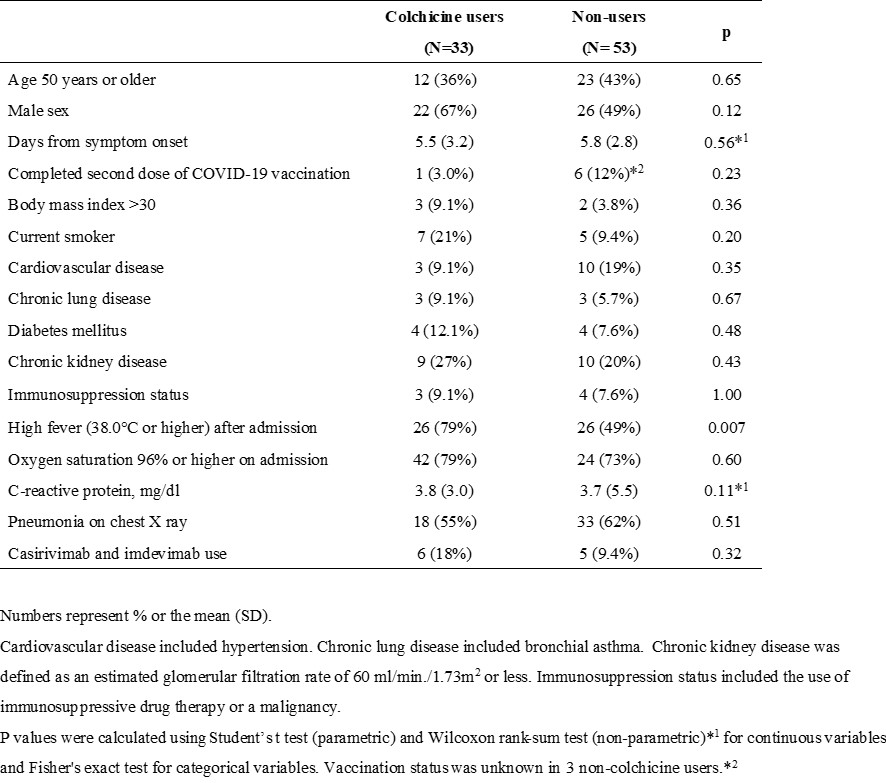 Results: Table 1 shows the baseline characteristics of both patient groups. A high fever (38.0 degrees or higher) after admission was recorded on Day 1 and/or Day 2 in all the patients and was associated with colchicine use (odds ratio [OR]: 3.86; 95% confidence interval [CI]: 1.48-11.0.; P=0.005). All variables listed in Table 1 were used in IPTW adjustment.
