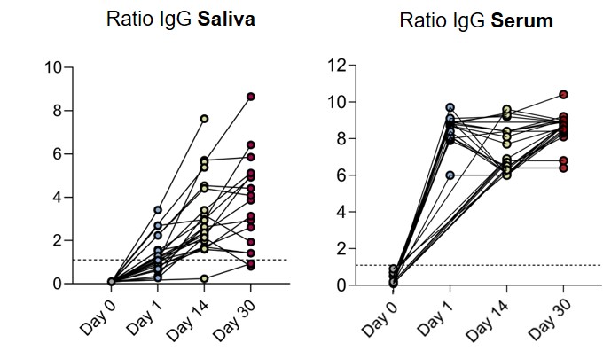 Results: We collected 92 serum and 75 saliva samples from 26 individuals at four consecutive timepoints (Figure 1). Anti-SARS-CoV-2 IgG titers were detected in all individuals´ serum and saliva samples, from day 1 and for the next 30 days after PrEP, regardless of diagnosis, therapy, total serum IgG or peripheral circulatingCD19+ B-cells. Serum IgG increased rapidly above the positivity threshold at day 1 and remained stable from day 14 to 30 (Figure 1, right panel), reaching levels comparable to those found in healthy individuals after full vaccination (1). Saliva IgG levels grew steadily from administration day to day 14 and then reached a plateau at day 30 (Figure 1, left panel). There were no side effects recorded. Five participants (19.2%) had a close contact with a SARS-CoV-2 infected person. All except for one remained asymptomatic and tested negative on PCR. The patient who tested positive experienced a mild COVID-19 with fever and cough.