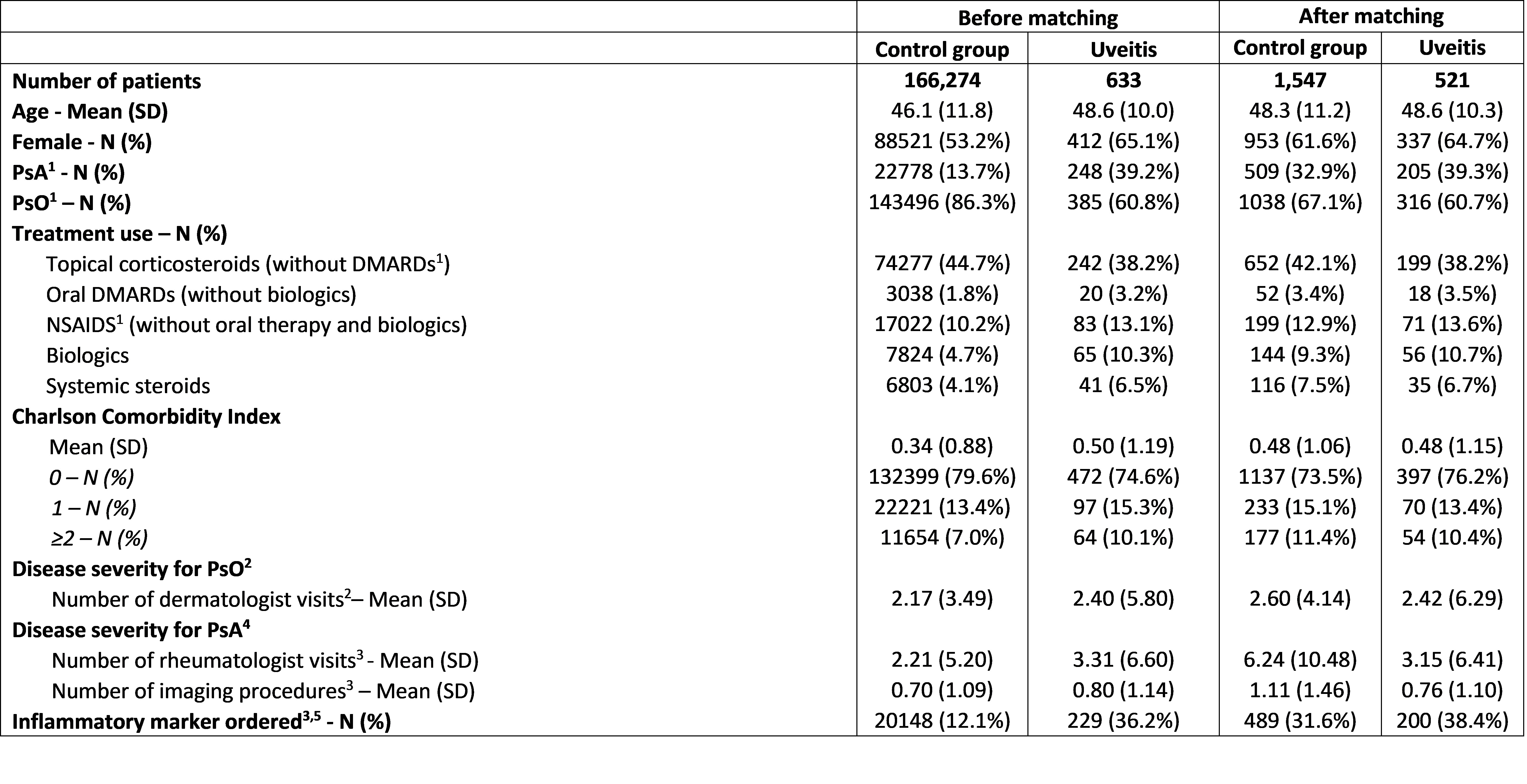 Table 1. Baseline characteristics of PsA and PsO patients with and without uveitis before and after matching