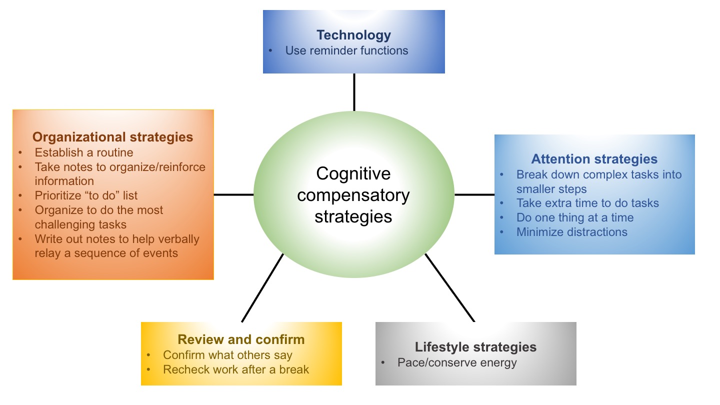 Figure 1. Cognitive compensatory strategies diagram showing different types of strategies use in patients with SSc. This diagram only presents strategies that have the median value of 2 or higher. Frequency was rated on a 4-point scale ranging from 0 (never), 1 (rarely), 2 (sometimes), 3 (often), to 4 (all the time).