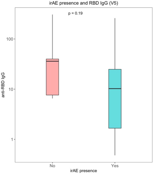 Figure 3. Anti-RBD IgG shown for aPD-1 patients without (red) and with (blue) history of irAEs.
