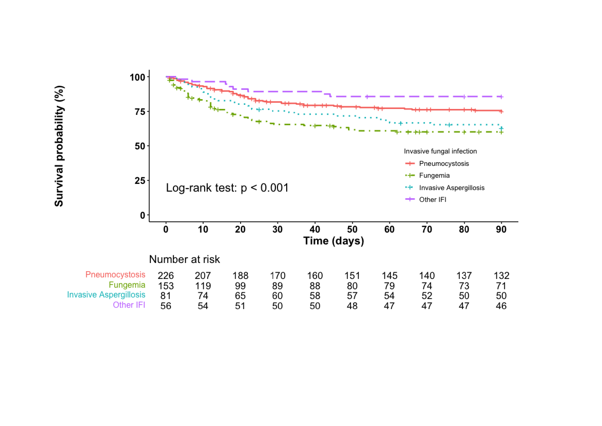 Results: From 2012 to 2018, 552 individuals with IFD and AID were included, mainly with Pneumocystis jirovecii pneumonia (PCP) (n=229, 41.5%), fungemia (n=168, 30.4%) and invasive aspergillosis (n=84, 15.2%) (other IFD: n=58; multiple IFD: n=13). Rheumatoid arthritis (RA) and systemic vasculitis were the most frequent underlying AIDs in patients with PCP (respectively n=55 and n=42) and invasive aspergillosis (n=15 and n=14). Inflammatory bowel diseases (IBD) were predominant in fungemia (n=36). At IFD diagnosis, 346 (62.7%) patients received glucocorticoids (GCs) and 321 (58.2%) received immunosuppressive agents, mainly methotrexate (n=113), azathioprine (n=38) and cyclophosphamide (n=27). Mortality at 90 days was 34.5% (174/504), and was higher in invasive aspergillosis (31/81, 38.3%) and fungemia (72/148, 48.7%) compared to PCP (54/207, 26.1%) (p< 0.001) (figure 1). Fungemia (hazard ratio 2.4, 95% confidence interval 1.6-3.5, compared with PCP), advanced age (HR 2.1, 95% CI 1.3-3.2, for age ≥70 years compared with age < 55), cirrhosis (HR 3.7, 95% CI 2.1-6.4), and use of high-dose GCs ( > 0.3 mg/kg/day for > 1 month at IFD diagnosis) (HR 1.7, 95% CI 1.2-2.3) were independently associated with higher mortality. Clustering analysis identified three clusters: Cluster 1 consisted mainly of patients with PCP, IFD occurred 1 year after AID diagnosis in median, and almost all received high doses of GCs. Cluster 2 included mostly patients with RA, less frequently receiving GCs, and IFD occurred long after AID diagnosis (median 6 years). Cluster 3 included almost exclusively fungemia, occurring long after AID diagnosis (median 8 years). Cluster 2 (24.4%) displayed a lower mortality than the other two (cluster 1: 39.5%; cluster 3: 40.5%; p = 0.002). PCP (n=239) mostly occurred early after AID diagnosis (median 2 years, interquartile range 0-11) except for cases with RA (9 years, IQR 3-18). CD4+ T cells were measured within 3 months of PCP diagnosis for 78 patients (32.6%): median level was 472.5/mm3 (IQR 198-858), 49.6% (IQR 36.8-65.3) and CD4/CD8 ratio 2.2 (IQR 1.3-4.3). Among cases of fungemia, patients with IBD had an improved survival (HR 0.19, 95% CI 0.07-0.52).