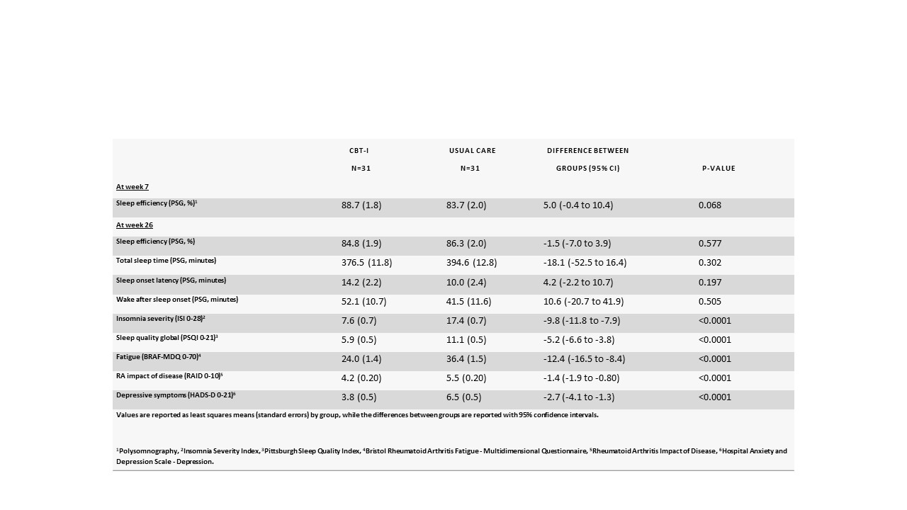 However, for all secondary sleep and RA-related patient-reported outcomes, there were statistically highly significant differences between CBT-I and usual care e.g. Insomnia Severity Index (ISI, range 0-28, higher is worse): -9.8 [95% CI -11.8 to -7.9], RA impact of disease (RAID, range 0-10, higher is worse) -1.4 [95% CI-1.9 to -0.80] and Patient Global Assessment (range 0-100, higher is worse): -13.0 [95% CI -20.9 to -5.1] at 26 weeks' follow-up.
